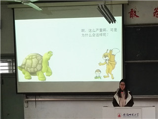 经过协会指导老师和环协骨干成员的认真批改,30名参赛者突破重围进入复赛。2016年4月17日下午两点半,安徽师范大学环境保护协会于生化楼2033、2034同时举行绿色使者选拔赛复赛。复赛以模拟课堂的形式开展。现场气氛有序而轻松,参赛者们积极投身于环保PPT的演说中,以多种多样的演说方式赋予了本次复赛更多的意义和价值。他们巧妙地将谜语,小故事,有奖竞答,诗词歌赋和演讲内容融合在一起,并穿插相关的环保宣传片和绿色歌曲,让现场观众享受了一场视听盛宴。最终,由复赛甄选出的六组选手成功进入决赛环节。
