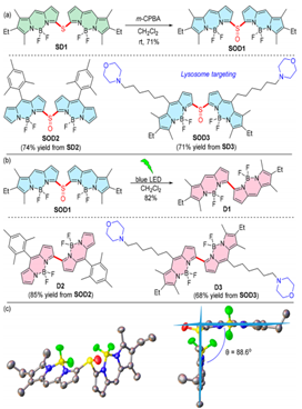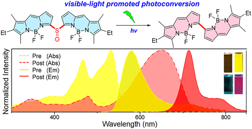 功能共轭分子团队一直围绕含硼多吡咯染料的构建和应用开展研究,在前期双激子耦合的乙烯桥联氮杂BODIPY二聚体(Unique Double Intramolecular and Intermolecular Exciton Coupling in Ethene-Bridged aza-BODIPY Dimers for High-Efficiency Near-Infrared Photothermal Conversion and Therapy,Angew. Chem. Int. Ed. 2022, 61, e202211081)和B(III)-单氮杂亚卟啉(Boron-Templated Synthesis of B(III)-Submonoazaporphyrins: The Hybrids of B(III)-Subporphyrinsand B(III)-Subporphyrazines,J. Am. Chem. Soc. 2022, 144, 6692-6697)的研究基础上,该团队发展了一类全新的基于亚砜桥联BODIPY二聚体的光转换荧光团。在可见光激活下,这类亚砜桥联BODIPY二聚体光转换荧光团发生高效的、不可逆地分子内消除亚砜(SO)物种以生成相应的α,α-直接连接的BODIPY二聚体。这种新的光激活转化机制扩展了细胞内光转换探针的工具箱,为发展超分辨率单分子定位成像的有机小分子荧光团的设计合成提供了一种新的通用策略。