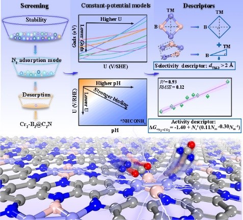 开发利用CO2和N2生产尿素的高性能电催化剂在缓解环境污染和能源危机方面具有巨大潜力。近日,美高梅4858线路登录黄玉成教授课题组在第一性原理的框架下,结合数据驱动技术,在26种四重TM2-B2活性位负载的多孔C2N单层中,筛选出Cr2-B2@C2N为最有前途的电催化剂,其在中性环境中具有–0.37 V(vs RHE)的低极限电位。该电催化剂的高选择性和活性可分别用几何结构描述符和电子结构描述符来解释,这些描述符与TM-B距离、d电子的数量和TM原子的电负性密切相关。在筛选过程中,几何描述符可将范围缩小到前过渡金属体系,而电子描述符锁定含Cr的体系。这一研究结果为尿素的电化学合成提供了一个新的视角,有助于合理设计高效的尿素合成电催化剂。