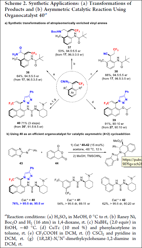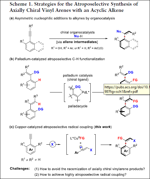 轴手性结构不仅广泛存在于天然产物、药物和功能分子材料中,而且在不对称催化领域中被用作手性配体和催化剂的优势骨架。因而,在过去的十年里化学家们发展了许多高效的策略用来合成轴手性骨架结构。然而,相对于大量文献报道联芳基轴手性化合物的合成,作为另外一类重要的阻转异构体,在取代烯烃和芳环之间具有限制立体旋转轴的轴手性烯基芳烃的文献报道合成方法却非常有限。