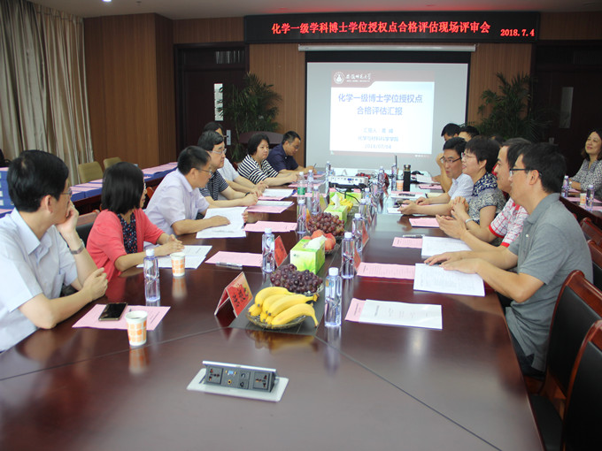 7月4日,安徽师范大学化学一级学科博士学位授权点合格评估现场评审会在理科实训大楼702会议室举行。国务院学位委员会化学学科评议组成员、南京大学郭子建院士担任评估专家组组长、中科院上海有机化学研究所赵刚研究员,南京大学徐静娟教授、王新平教授,中国科学技术大学俞书宏教授、崔华教授、陈昶乐教授担任专家组成员。学校副校长彭凤莲、研究生院副院长王昊、美高梅4858线路登录领导班子成员、院教授委员会负责人、化学博士学位点负责人及部分师生代表参加会议。
