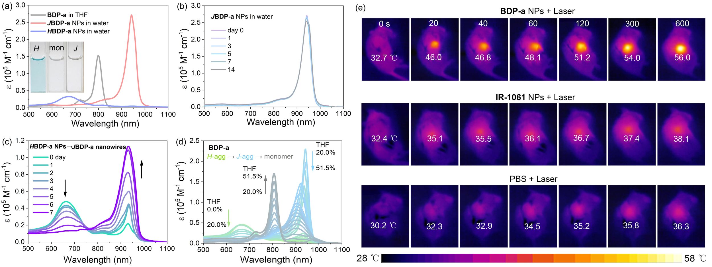 图 2.(a)BDP-a的单体、J-聚集体和H-聚集体的吸收光谱。(b)存放14天后JBDP-a NPs水溶液的吸收光谱。(c)HBDP-a NPs逐渐转化JBDP-a NPs 连续1周的吸收谱图变化。(d)逐渐增大良性溶剂THF的比例,HBDP-a NPs依次转变为J-聚集体和单体。(e)在超低光密度下进行光热与光动力联合治疗HBDP-a NPs与商品化光热剂IR-1061 NPs以及PBS的对照红外照片。