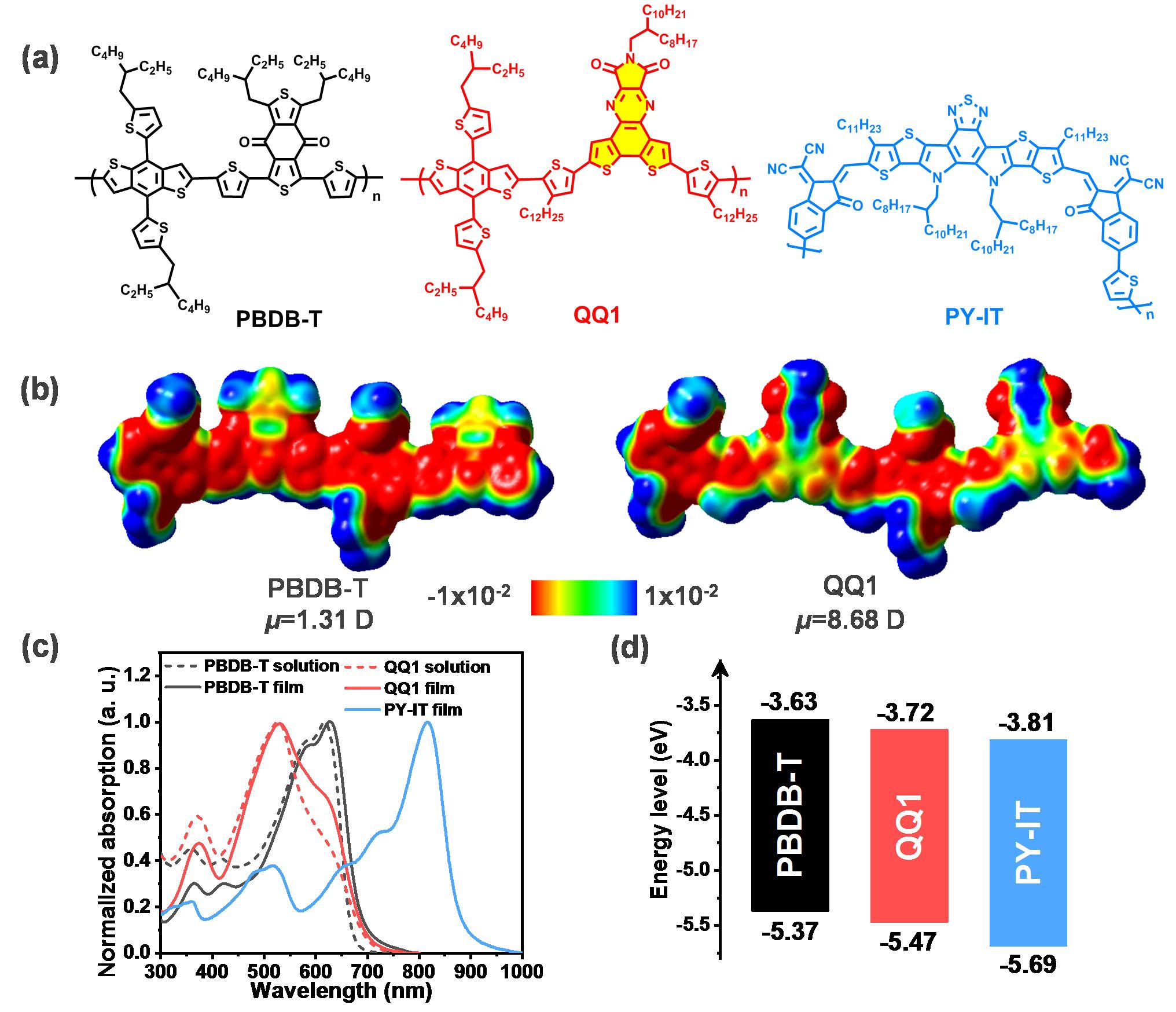 2. (a) PBDB-TQQ1PY-IT的化学结构;(b) PBDB-TQQ1的表面静电势;(c) PBDB-TQQ1,和PY-IT的吸收图谱;(d) 材料的能级图。