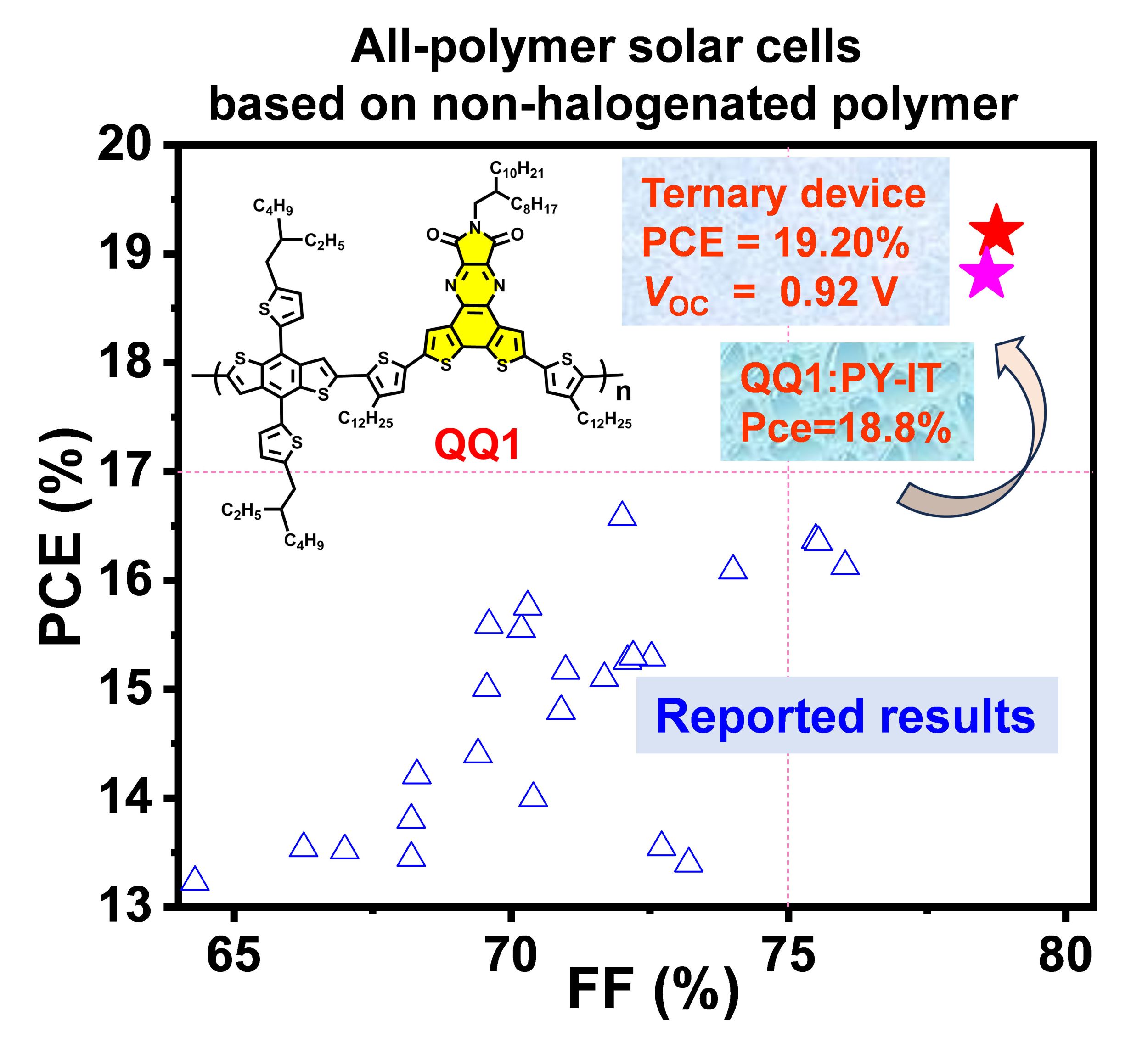 最终,基于QQ1PT-IY的二元全聚合物太阳能电池实现了18.81%的能量转换效率,当引入经典高电压非富勒烯受体材料F-BTA3作为第三组份时,器件实现了19.20%的能量转换效率。这些结果为合理设计用于全聚合物太阳能电池的新型非卤聚合物给体提供了新的思路。