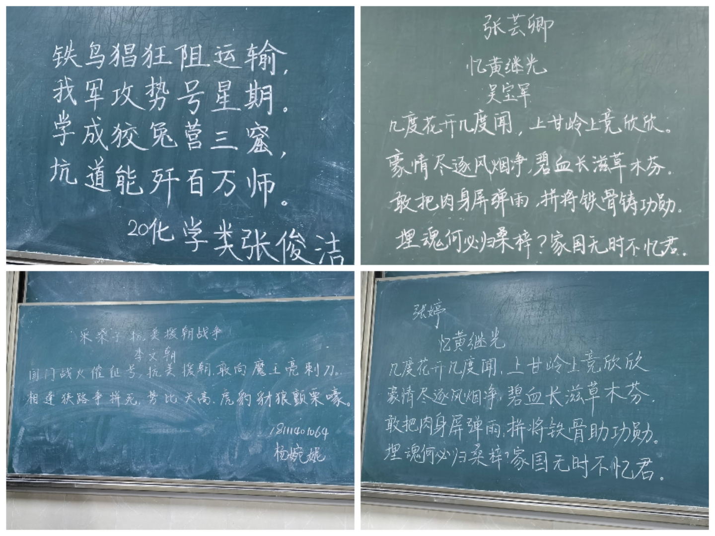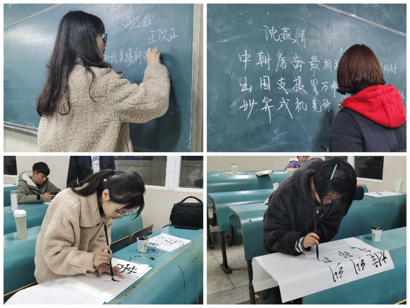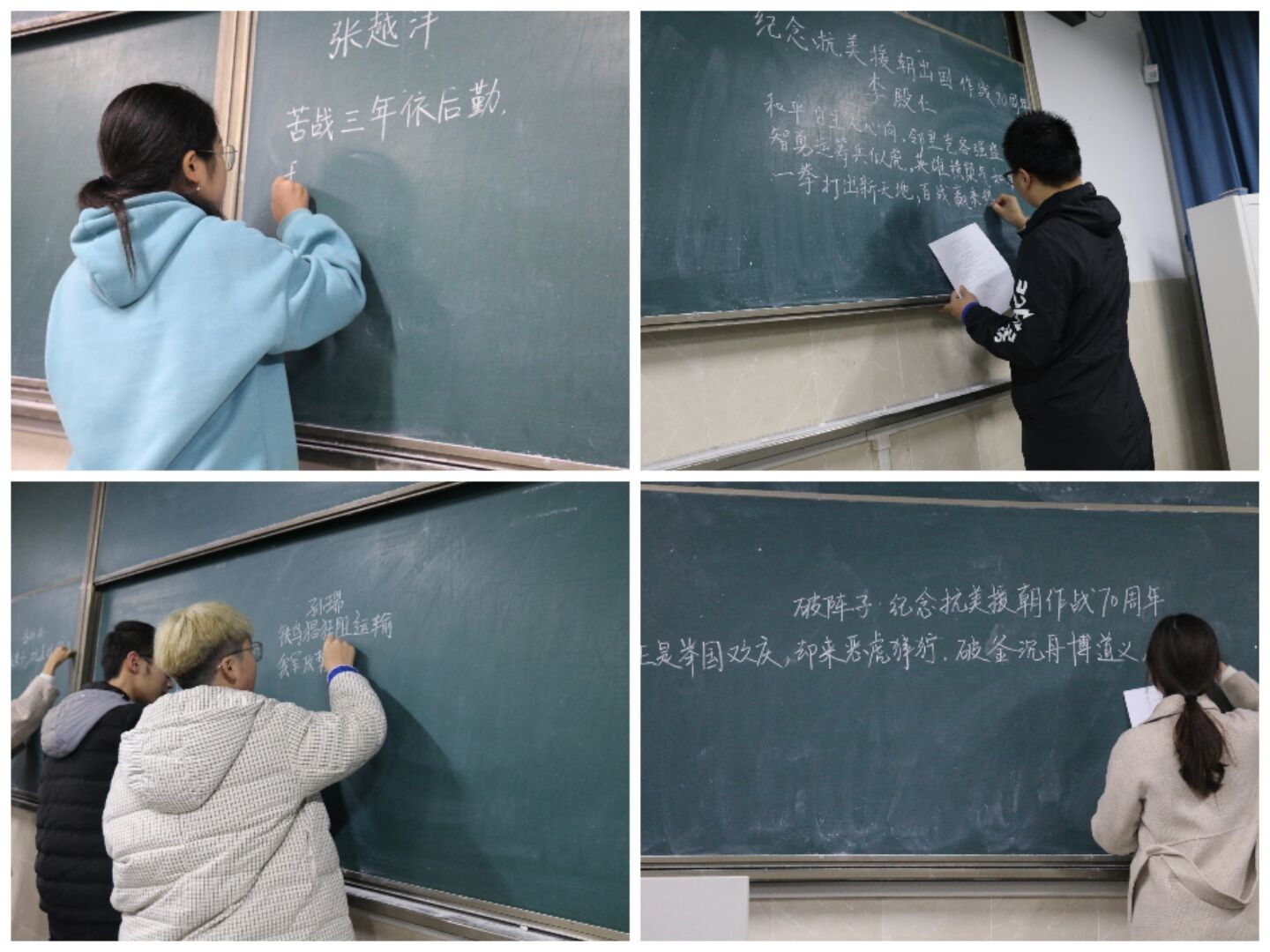 本次比赛参赛对象以在校一、二、三年级本科生为主,鼓励其他年级学生参与,选手同时参加毛笔字、钢笔字、粉笔字三项比赛,各项比赛分区域依次进行。参赛者遵从主持人的安排进行比赛:硬笔字书写流畅结构匀称,笔划间展示学子傲气;粉笔字板书周正规范整齐,横竖间流露师者风范;毛笔字笔走龙蛇潇洒飘逸,撇捺间显现青年担当。选手们借诗句抒发壮志豪情,表达了对抗美援朝精神的致敬。