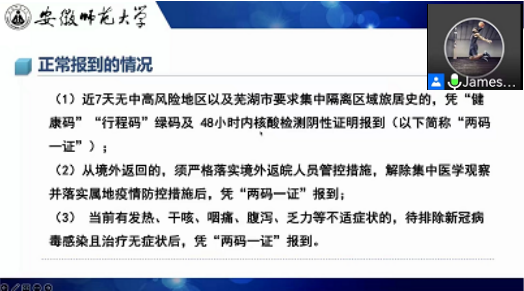 本次主题班会围绕报到具体安排、安全教育、开学后相关事宜介绍三个方面展开。强调新生应备齐报到材料,安排好返校行程,妥善安置好个人行李物品,有序入校入宿舍。同时要求学生重视疫情防控,做好返校途中的自我防护,严格执行入学报到防控措施,入校后及时进行三天两检、五天一检等任务,把常态化疫情防控作为新生开学的重要任务。此外,辅导员们向新生介绍开学后学校的相关安排,提醒同学做好入校体检和讲座等活动准备,要求同学们尽快调整状态,以饱满的热情投入新学期各项活动和学习中。对于新生的自由提问进行了全面的答疑解惑。