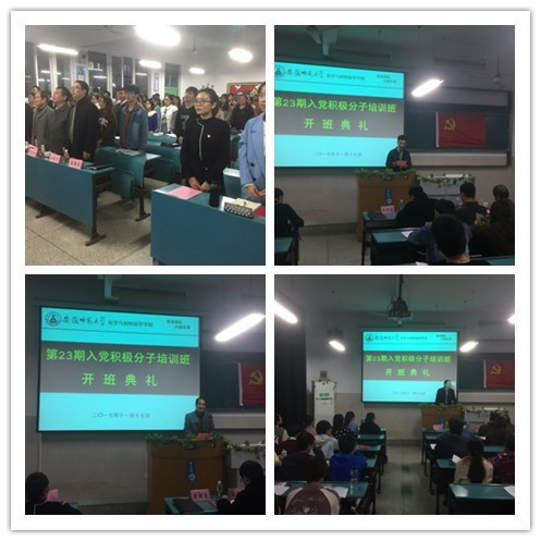 开班典礼在庄重雄伟的国歌声中开始,首先由王雨兵老师宣读培训班班委任命及班级管理制度,之后指导老师吴华强汇报了本学期党校工作安排,接着22期优秀学员邓传玉发言,强调了作为入党积极分子的身份意识,要坚定信念,加强理论学习的同时联系实际,做同学们的表率,在同学之中起到模范带头作用。随后23期学员代表郝艾婷做了关于党课学习的发言,她代表全体学员表明态度,要主动学习,自主学习,严守纪律,加强自我约束,时时刻刻以党员的标准要求自己。最后汪俊武老师讲话,塔肯定了学员的热情,对所有入党积极分子表达了深切的期望,赢得热烈掌声。