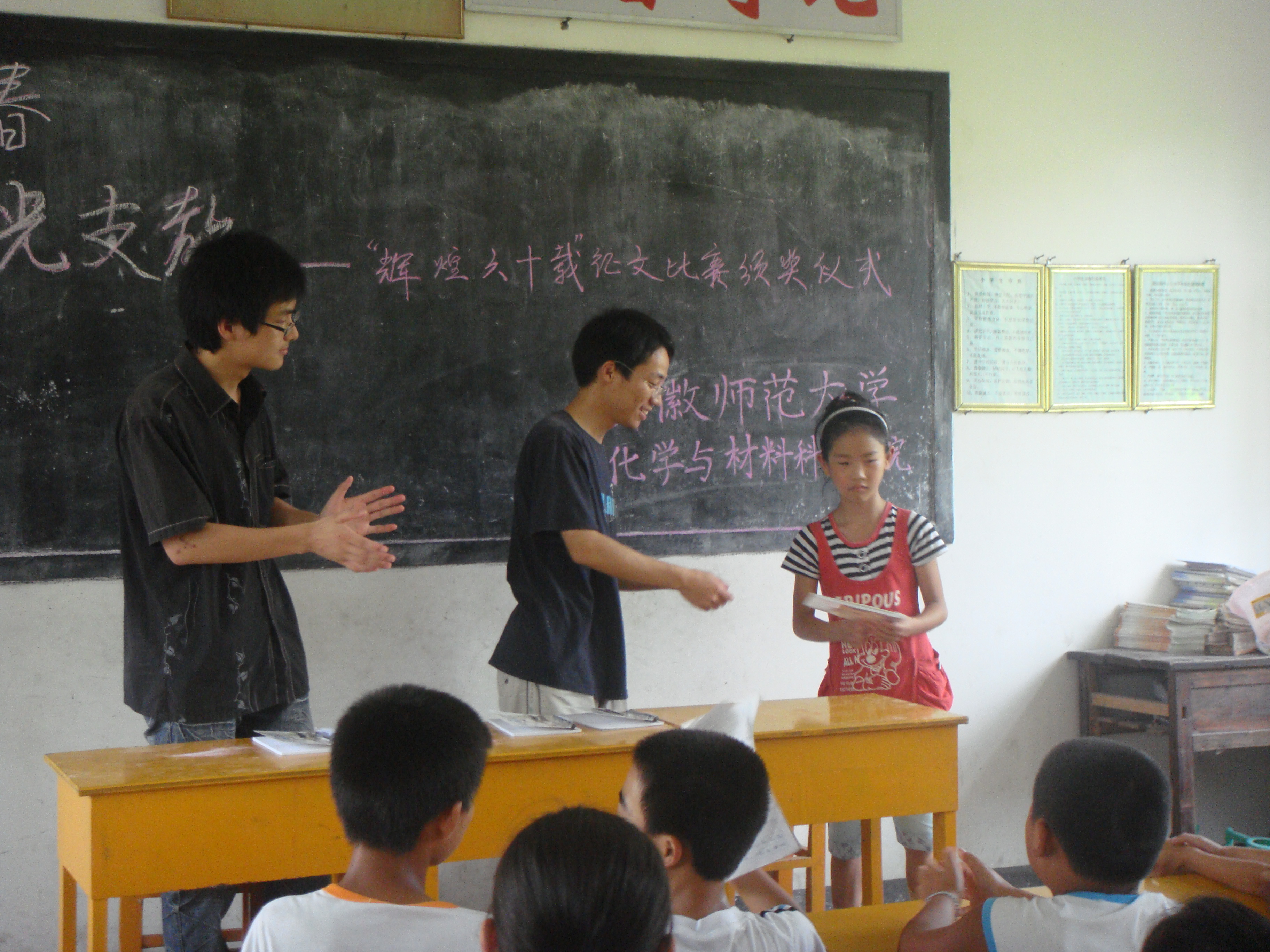 义教学校的学生们参赛热情非常高涨,通知发出的几天后,支教队员们共收到76篇参赛作品。作品多来自高年级同学,他们用自己的切身的体会、真实的情感给祖国母亲献上一份发自肺腑的贺礼。支教队员们于7月16日晚,对作品进行了公平、公正的评选,最后共选出10篇优秀征文作品。7月17日上午,在响齐办中心学校举行了此次征文比赛的颁奖仪式。首先由支教队员王中磊对征文比赛的情况作简短总结,他表扬了同学们高涨的参赛热情、激励大家在任何时刻都要热爱自己的祖国,随后进行热烈的颁奖仪式。获奖的同学纷纷表示一定要好好学习,为祖国的建设贡献力量!