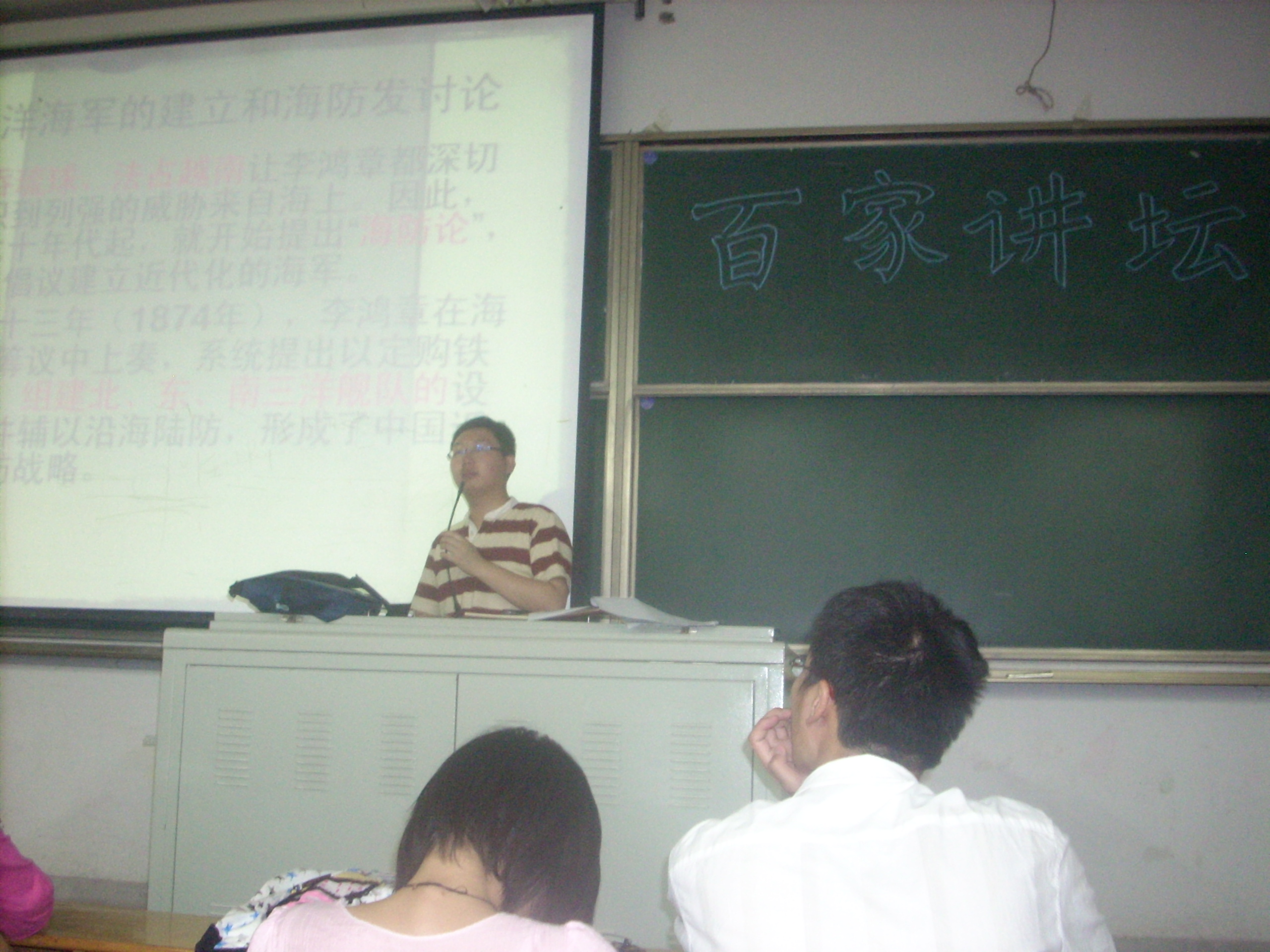本期讲堂主讲人是来自06级化学专业的周磊。长期以来,在人们的印象中李鸿章是一个卖国贼,是个颇受争议的人物。但是作为本期讲堂的主人公,周磊同学用详尽细致的解说、恰到好处的悬念设置、极具说服力的的视频展示,带领我们翱游在那一段难以忘怀的历史中,让我们看清了很多被歪解,甚至是被蒙蔽的历史事实。观众看到的是一个爱国爱民、满腔正气、机智勇敢的外交家李鸿章,而不是歪解后人人唾弃的卖国贼,心底不免有深深的震撼。