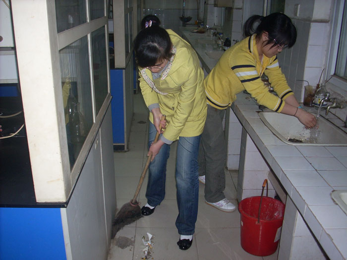 全体学员在培训班班长和各小组组长的组织和带领下,分组打扫了基础化学实验室、分析化学实验室、有机化学实验室、应用化学专业实验室。活动期间,大家忙得不亦乐乎,每位同学都积极投入,热情高涨,配合默契,在大家的共同努力下,各实验室的面貌焕然一新。