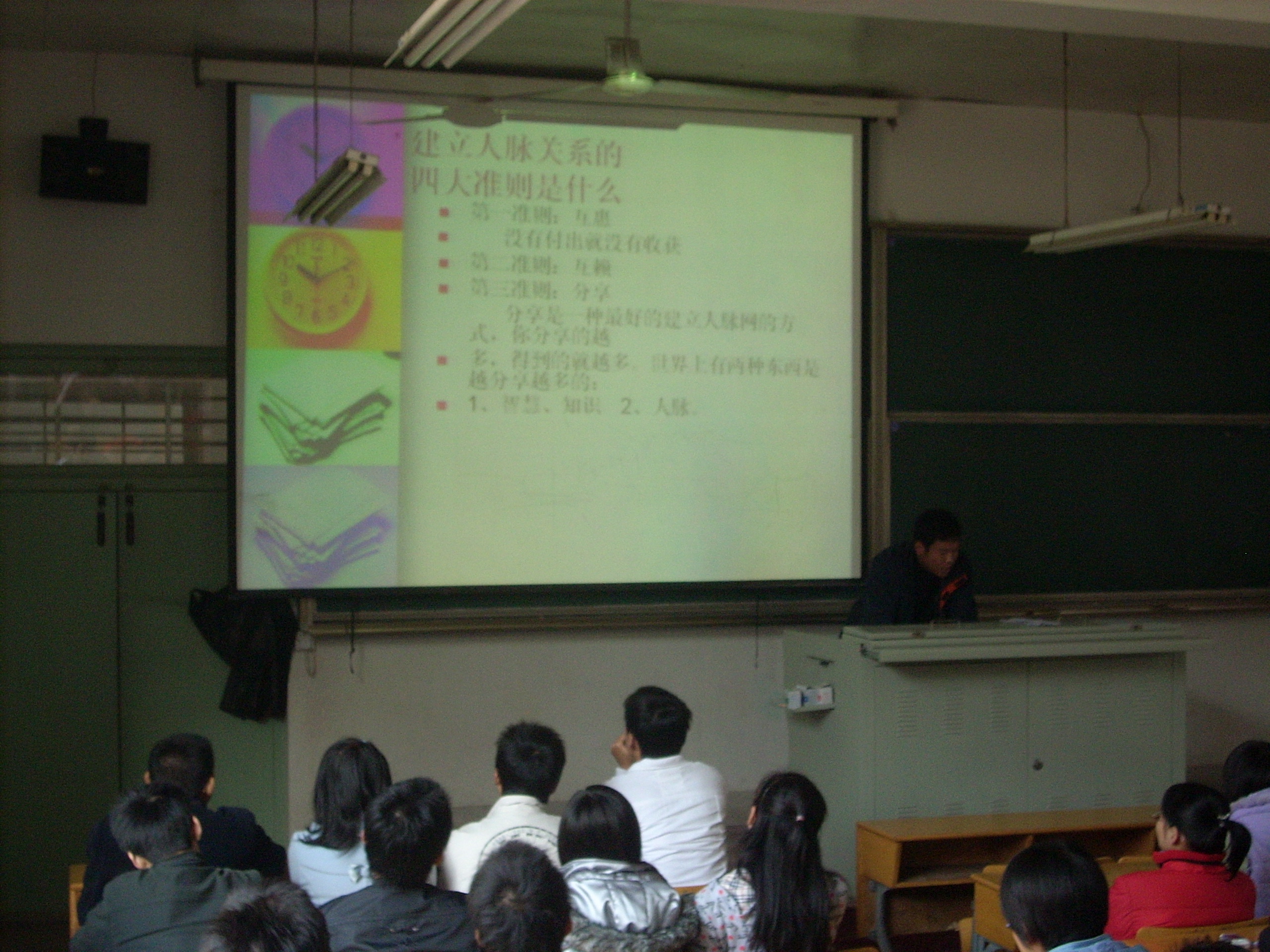 本次“百家讲坛”于11月30日拉开帷幕,共分六讲,第一讲是由07级化学蒋建伟同学主讲,其主题是“人脉与成功”。