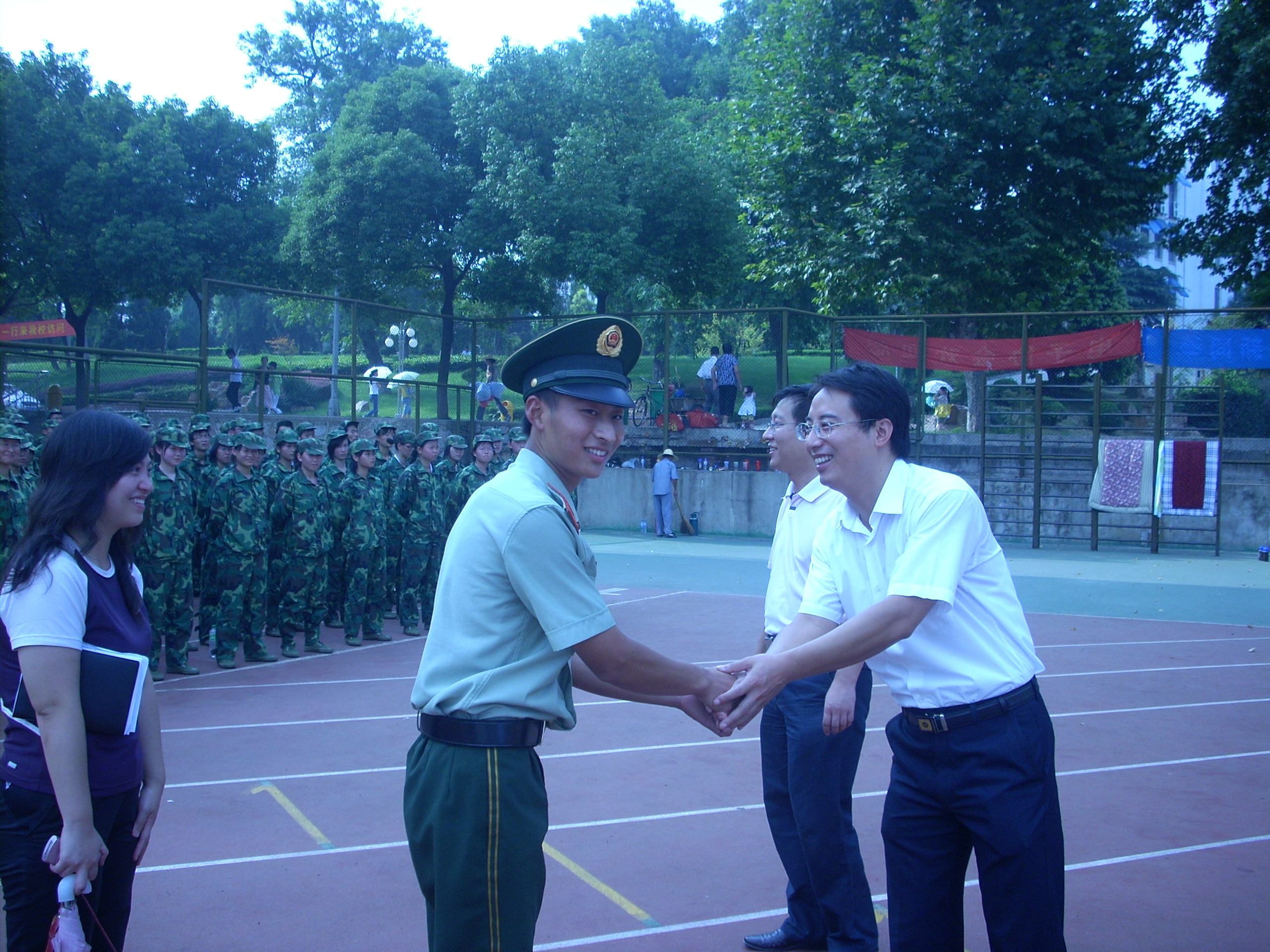 9月10日下午3:00,美高梅4858线路登录党委季爱新书记,院长王绍武教授,党委汪俊武副书记在08级辅导员的陪同下逐一慰问了各排的教官和参训新生,并与他们亲切交谈。学院领导对在炎炎烈日下言传身教、认真、细致、耐心的教官们致以真挚的感谢。同时,学院领导鼓励新生要学会吃苦、严于律己,发扬美高梅4858线路登录顽强拼搏的优良传统,高标准、高质量地完成大学的第一课。