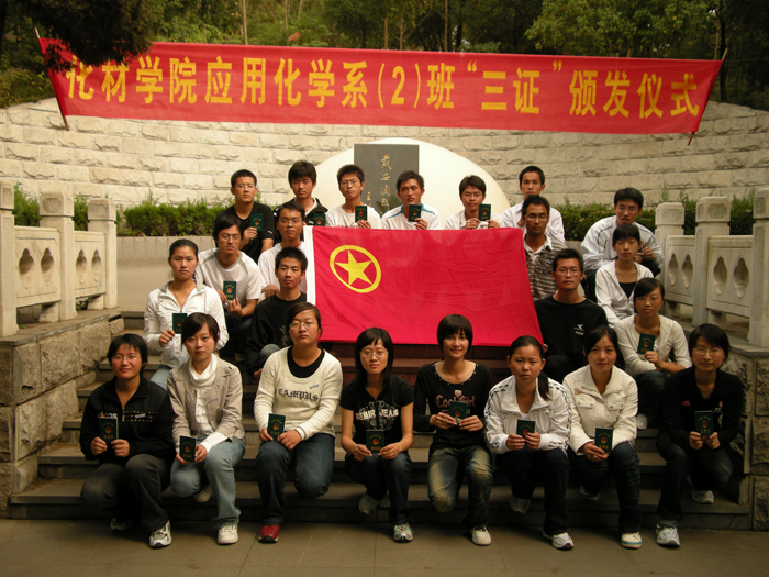 10月18日上午9点半,美高梅4858线路登录08级应用化学二班在赭山公园戴安澜墓前举行了“三证”颁发仪式。辅导员涂薇老师、班主任谷翠萍老师以及二班全体团员参加了仪式。