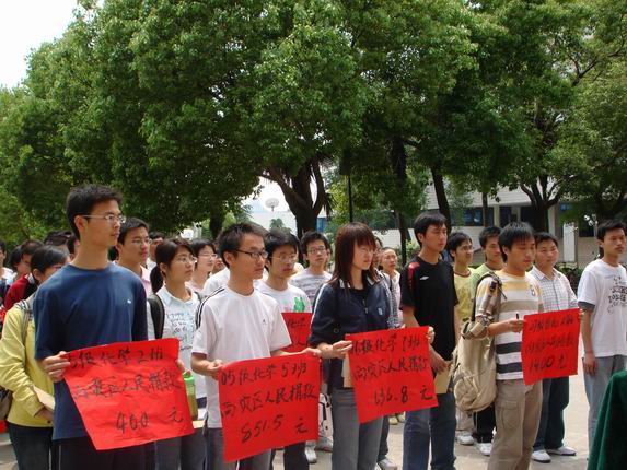 2008年5月15日12:30,一场由美高梅4858线路登录团委、学生会主办,07级材化专业承办的,为四川灾区人民募捐的活动在生化楼前隆重举行。本次活动共筹得学生捐款人民币14423.3元和1美元,院领导和辅导员老师捐款2500元。学院领导季爱新书记、王绍武院长,朱昌青副院长,胡敏副院长,汪俊武副书记,团委书记余研霞及各班级辅导员老师也参加了募捐仪式并带头捐款。