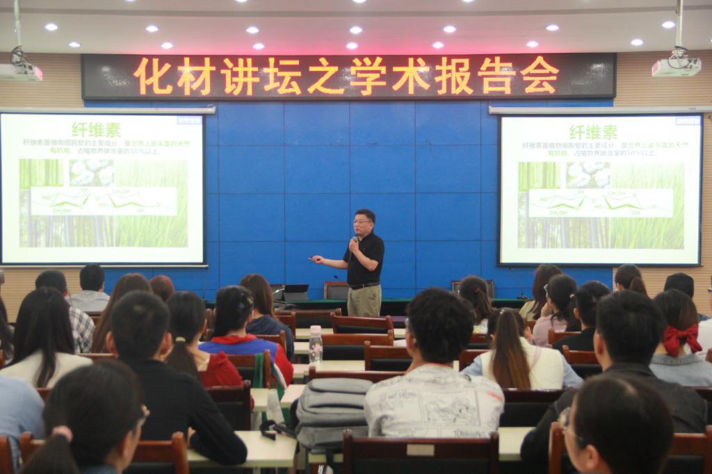 张军研究员作了题为“纤维素绿色加工新方法与功能化纤维素新材料”的学术报告。张研究员首先简要介绍了纤维素的一些优缺点。如纤维素具有优异的成纤性、成膜性和出色的力学性能。但由于聚集态结构和丰富的氢键网络,纤维素不熔化、难溶解,传统纤维素加工工业采用的是高能耗、重污染的粘胶工艺。该工艺复杂冗长,条件难以控制,能耗大,所用化学品种类多、毒性和腐蚀性强、消耗量大。生产过程中产生大量有毒、刺激性废气以及强酸性、难治理废水,环境污染严重。因此开发纤维素加工的高效绿色制备新技术具有重要的经济和社会意义。随后着重介绍自己课题组长期致力于纤维素材料绿色加工与功能化的新方法与新技术方面的研究,发明了可高效溶解纤维素的离子液体新溶剂体系,进而发展出以离子液体制备纤维素材料和功能化材料的新方法。并且与企业联合组建项目研发团队,开发出基于自主知识产权的离子液体的纤维素膜清洁生产新工艺的产业化技术,建成了世界首条采用清洁技术生产再生纤维素膜的生产线,实现了从基础研究创新到产业化应用的跨越。会后,张研究员还与与会师生进行了互动讨论,解答了师生的疑惑。