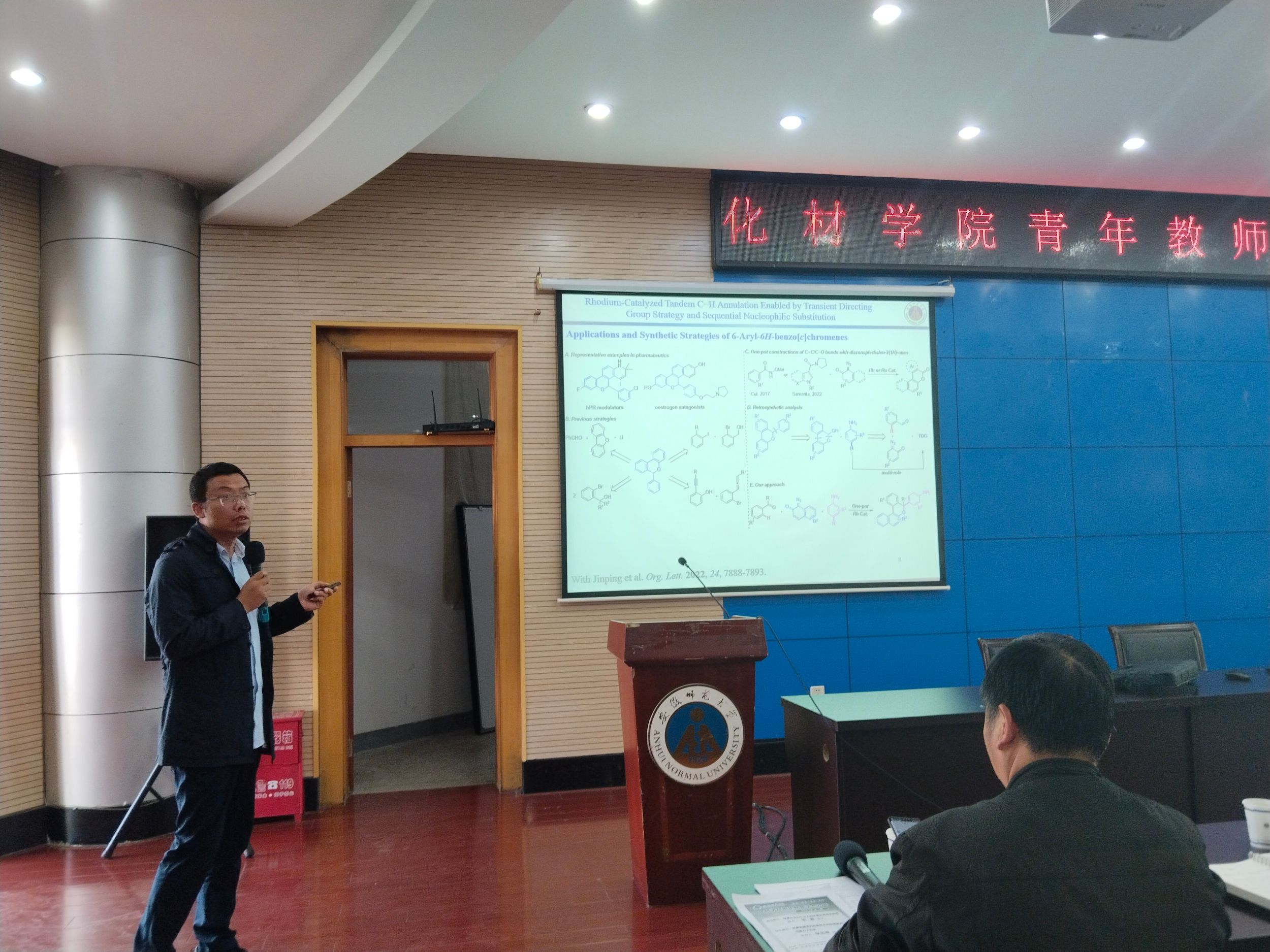 美高梅4858线路登录钦青博士和李忠原博士分别作了题为“电催化含N小分子的还原及其综合利用”、“过渡金属催化的串联不对称碳氢活化和功能分子合成”的学术报告。钦青博士介绍了在氮循环面临挑战的情况下,通过电化学手段实现绿色合成NH3路线。如通过杂原子碳掺杂进入氧空位,能够促进N2分子的活化还原。通过异质结位点调控催化中心的电子结构,抑制NO2-对Cu活性中心的毒化作用,提升NH3的活性和选择性。并设计富电子小尺寸纳米团簇作为双功能催化剂,实现高效电催化合成氨和尿素过程。李忠原博士介绍了通过瞬时导向基团策略和顺序亲核取代实现铑催化的串联C-H成环过程,详细阐述了一些有机化合物的合成策略以及应用。