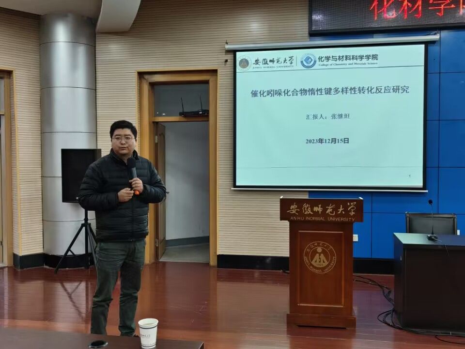 青年教师祝崇伟、宋品和张继坦分别作了题为“π-共轭纳米碳分子的构建及性能研究”、“二维材料在光催化领域中的应用研究”和“催化吲哚化合物惰性键多样性转化反应研究”的学术沙龙报告。祝崇伟博士首先介绍了sp2碳分子材料的研究背景,从sp2碳的同素异形体引入,讲解了碳-苯的应用探索(OPVs)以及carbon-OPEa的设计合成,阐述了sp2非交替纳米分子在不同氧化态下的分子构型。总结了非平面纳米碳分子目前存在的问题并对开发高导电率和电荷多维度传输的碳分子材料作出了展望。宋品博士分别从组装体材料、二维材料、3D打印介绍了他的研究工作。阐述了各个工作的研究背景,已经取得的阶段成果及在光催化领域中的应用。张继坦博士首先介绍了碳氢官能化选择性问题和吲哚骨架自身的修饰问题,分析了存在的挑战如反应活性、化学选择性、区域选择性、立体选择性和转化多样性等,然后提出了可通过导向策略、配体调控和新型催化体系等解决措施。最后讲述了未来研究计划中仍存在的挑战以及可通过配体/手性助剂、金属催化剂、偶联试剂等途径解决。
