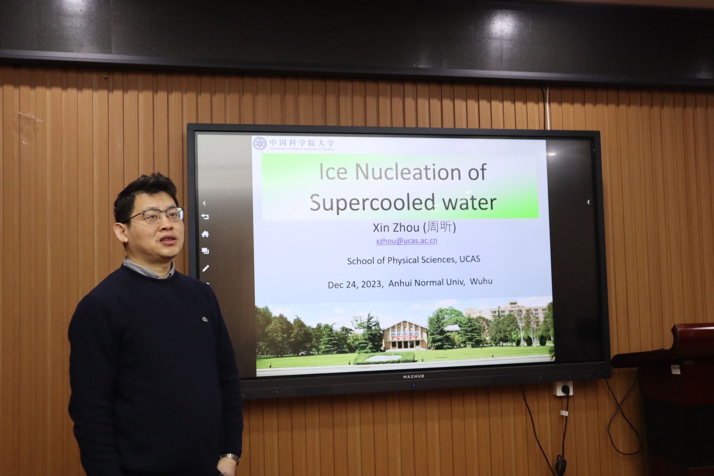 周昕教授作了题为“过冷水结冰成核机制研究”的学术报告。周教授介绍了其课题组最近的工作进展:发展新的理论分析方法,澄清试验发现的-40℃附近水过冷极限源于表面水结冰成核而不是长期以来认为的体相水结冰成核;理论与模拟分析纳米尺寸表面尺寸与几何对水结冰成核的影响;提出探测纳米瞬态临界核普遍方法,证实临界冰核存在并测量其与过冷温度关系;理论与模拟发现表面与水相互作用对水结冰成核的敏感调制可能性;发展可自发结冰的全原子水模型,有望广泛应用与复杂分子环境影响水结冰成核的微观机制,为组织器官冷冻保存研究提供重要计算模拟工具。会后,周昕教授与参会师生展开了一系列学术讨论,并回答了与会师生提出的问题。