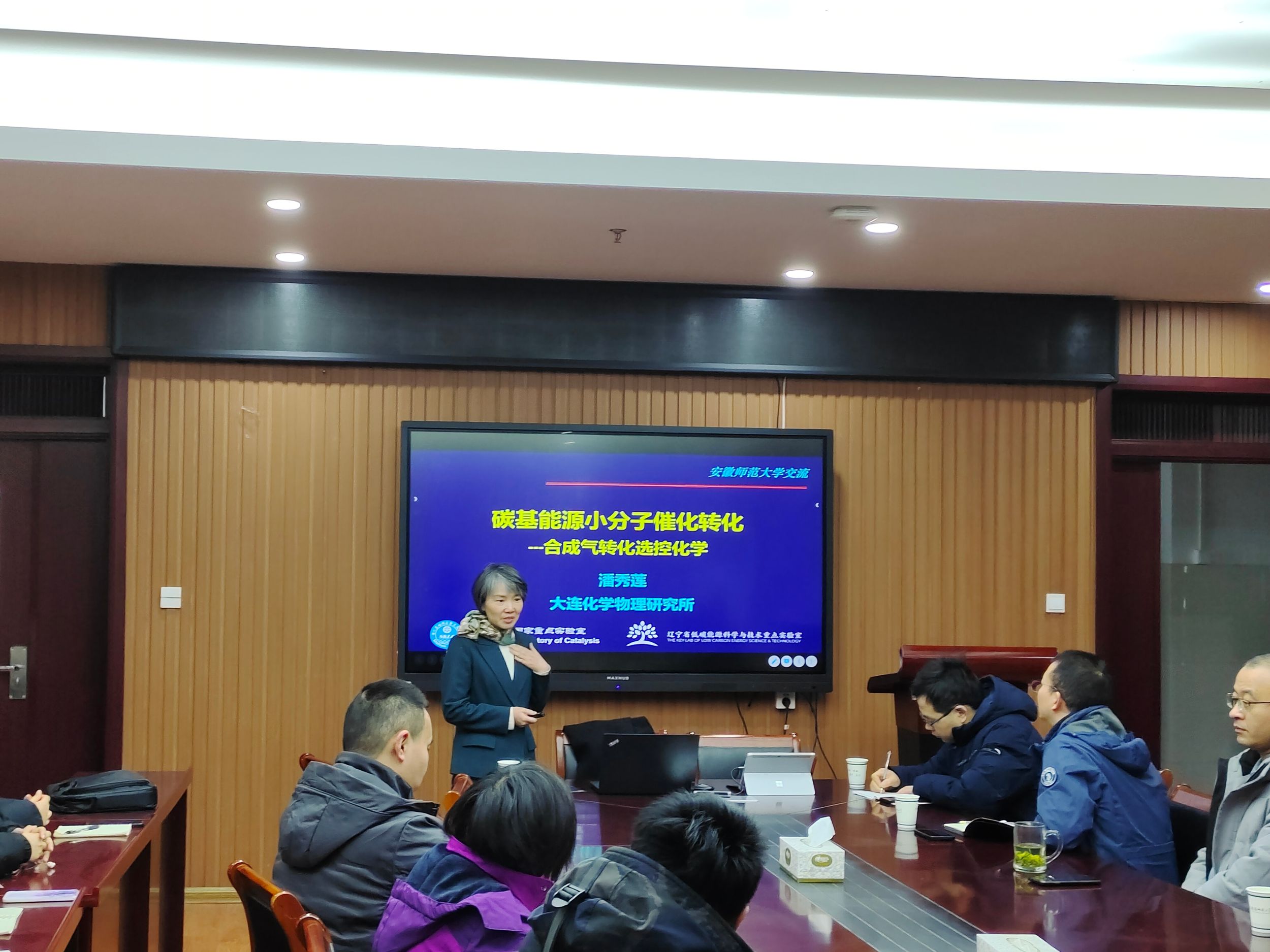 潘秀莲教授作了题为“碳基能源小分子催化转化”的学术报告。潘教授首先从经典费托合成反应的机理和产物控制的挑战两个方面介绍了一条煤制烯烃的新捷径。随后又详细讲解了OXZEO过程和机理,提出了一系列有利于该反应的操作。会后,潘秀莲教授与参会师生展开一系列学术讨论,并回答了参会师生提出的问题。