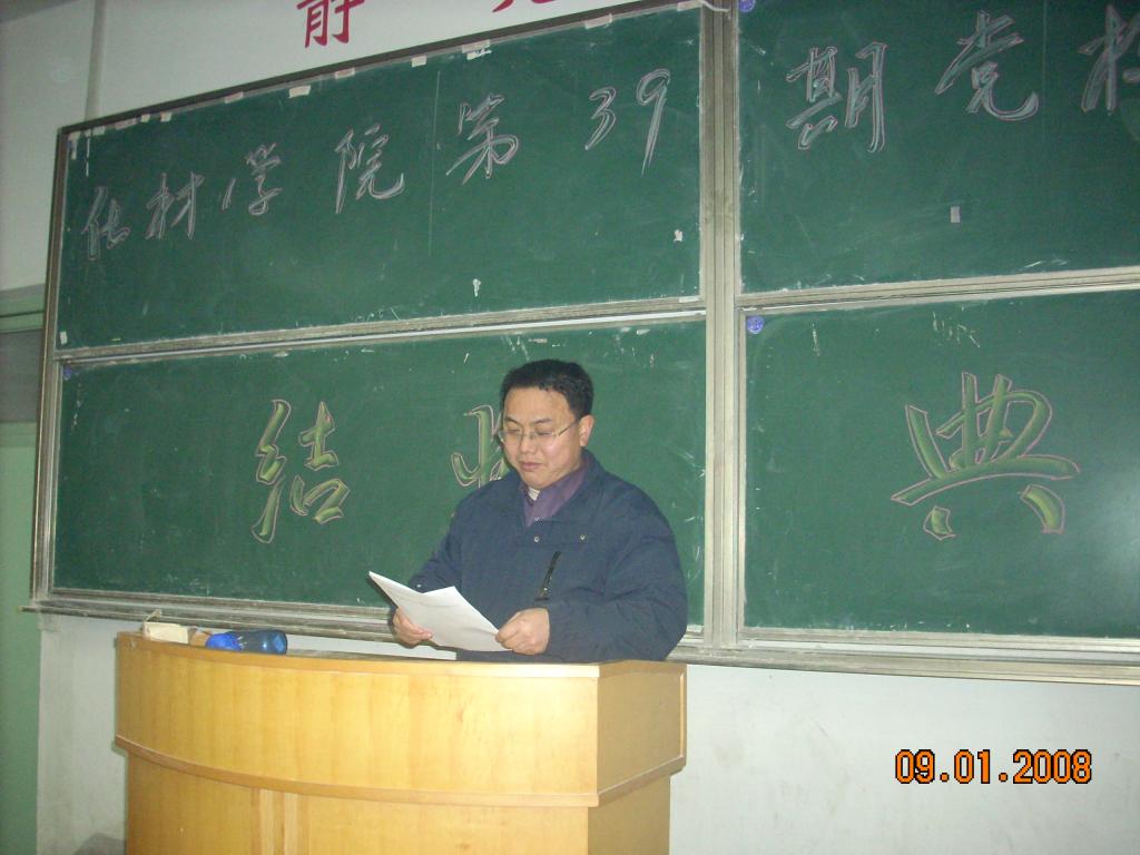 在校党校和院党委的关心指导下,经过近两个月的党课理论学习和实践活动的锻炼,美高梅4858线路登录第七期入党积极分子党课培训圆满结束,并于2008年元月8日下午4:30在生化楼2023教室隆重召开结业典礼。出席党校结业典礼的领导老师有美高梅4858线路登录党委史铁杰副书记,本期党校班主任苏桂琴和余妍霞老师。