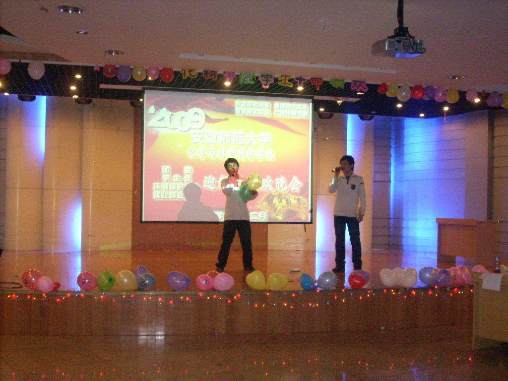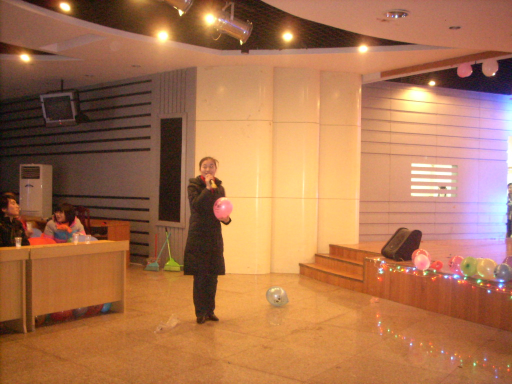 联欢伊始汪书记就作了幽默风趣的讲话,肯定了学生干部一学期辛勤的工作,并对下学期学院的学生工作寄予了厚望。联谊会正式开始后,节目丰富多彩,有老师及同学的深情演唱,也有清新脱俗的长笛演奏,其中还穿插了充满乐趣的游戏活动。联欢在运气球的游戏中达到高潮,五组参赛的选手分别来自学生会、团委、环协、就创以及张园园和余妍霞两位辅导员老师,现场观众为 各自代表队的选手呐喊助威,欢呼声掌声不绝于耳,气氛极其活跃。