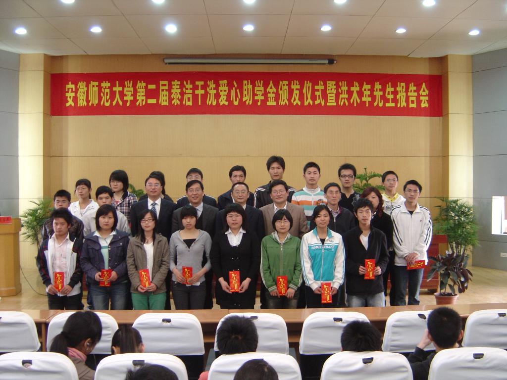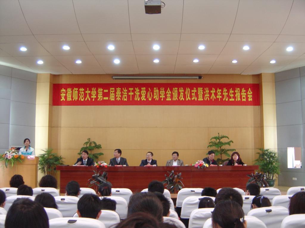 4月18日上午9时,安徽师范大学第二届“泰洁干洗爱心助学金”颁发仪式暨洪术年先生报告会在田家炳楼报告厅隆重举行。校党委副书记顾家山,上海泰洁集团公司董事长、总经理洪术年,美高梅4858线路登录党委书记季爱新、副书记汪俊武,泰洁公司总经理经理何天明、北方总部经理陈红等领导嘉宾出席了仪式。美高梅4858线路登录辅导员、受资助同学以及部分学生代表参加了此次活动。仪式由美高梅4858线路登录党委副书记汪俊武主持。
