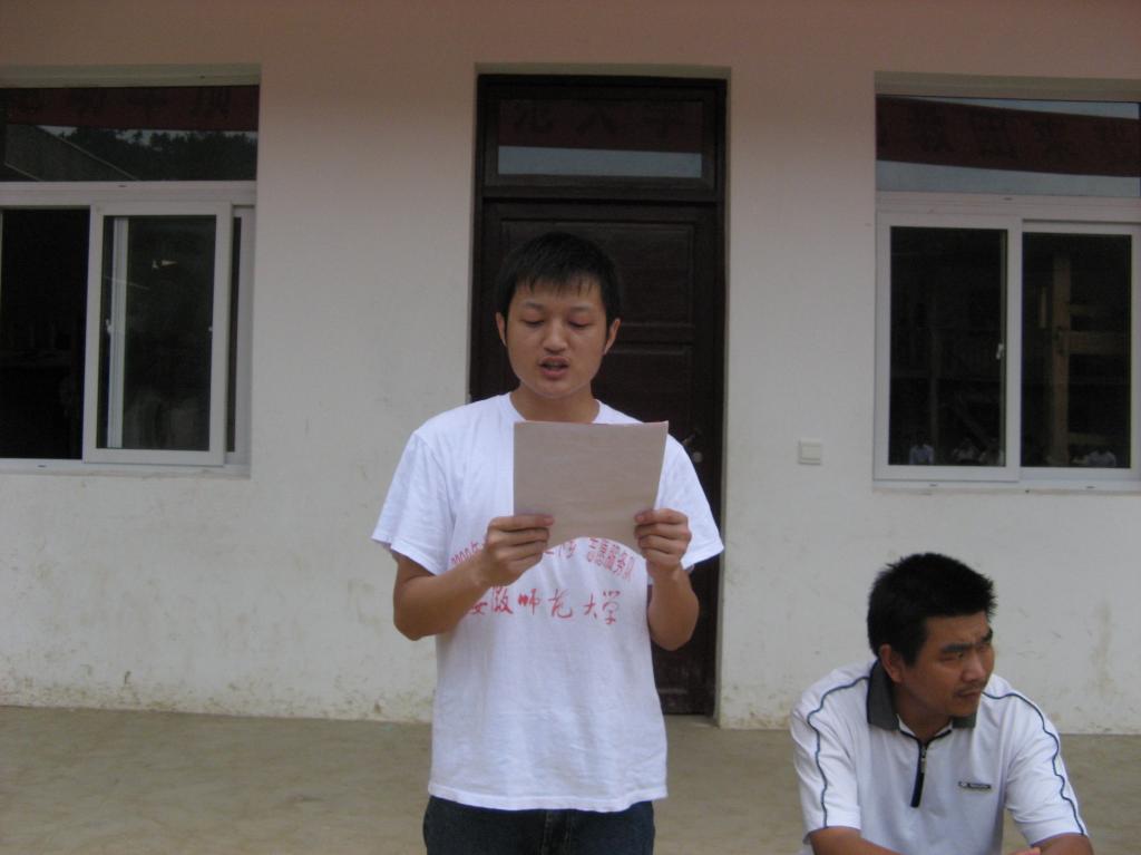首先,由美高梅4858线路登录魏杰顶同学代表全体阳光支教义务小组的成员向各位嘉宾及同学、家长介绍了我们小组支教安排的大概情况,并向关心此次活动的县、乡、村代表以及这里的热心村民表达了最真诚的感谢,字里行间流露出对这里淳朴民风的无限赞美。随后,由十分关心山区小学教育的宿松县教育局局长代表县领导对支教小组的到来表达了衷心的感谢和热烈的欢迎,并寄托了他对所有支教小组成员的殷切希望。接着,陈汉乡副乡长代表全体乡民表达了他们对支教小组成员无私奉献精神和不怕吃苦精神的赞扬,同时他还特别提出了学生安全问题是最基本的问题。朱湾村村支书和家长代表也都发了言,并表示他们一定会“有份力,使份力”,尽最大努力配合好支教小组的工作。
