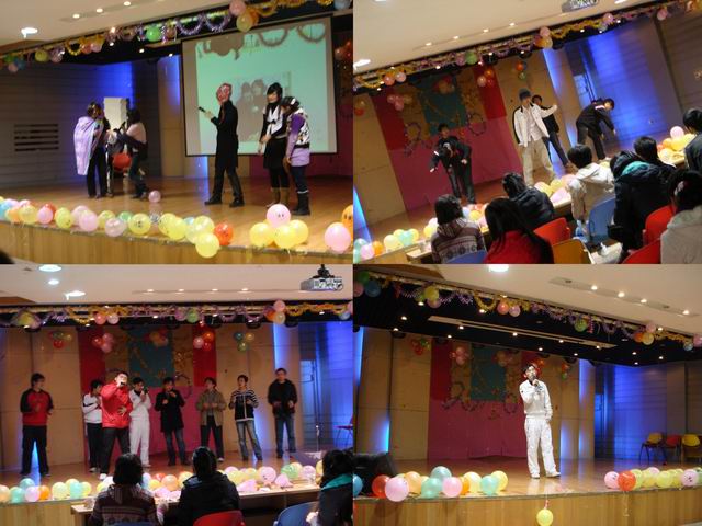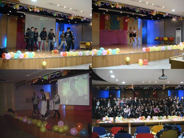 一曲《那一站》拉开联欢会的序幕。校园版的《唐伯虎点秋香》以男女生反串的形式,糅合多种元素及时尚话题,让大家在爆笑声中感受青春的无限活力;吉他弹唱《我想我是海》中,甘畅明亮的吉他音色搭配深情低缓的女声给同学们带来了一场动人心弦悦耳之旅;五个阳光男生带来的热舞《Sorry sorry》使全场气氛High起来;原创短剧《日记》以校园爱情故事为主题,引发观众对现代爱情观、人生观的新思考;歌舞《Show time》以或优美或动感的舞姿和或忧郁或激昂的演唱给大家带来一场精彩的视听盛宴;获得省健美操混双非专业组冠军的罗奎彪同学及其搭档也带来了动力十足的体操表演……最后,在优美的钢琴伴唱《童话》声中结束了整场联欢会。