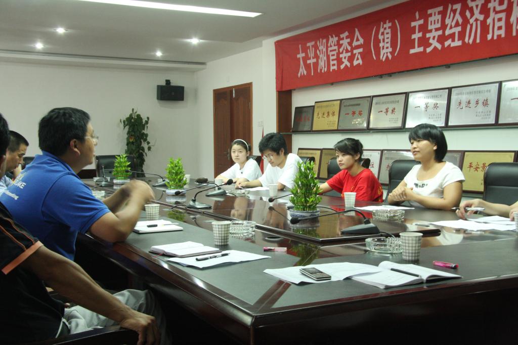 2010年7月8日,连绵的梅雨抵挡不住同学们的热情,早上7:30同学们便开始了一天的工作。上午,同学们与太平湖镇汪王岭村村委会戴支书取得联系,并就接下来的工作安排进行了磋商。下午,同学们兵分两路,部分同学走访村民了解情况;其余的同学在邵琴学姐和指导老师的带领下与镇政府接洽,与镇人大主席、纪委冯书记,发展办陈主任,规划办吴主任,农技站李站长,财政所王所长及汪王岭村戴支书在镇会议室举办了座谈会。