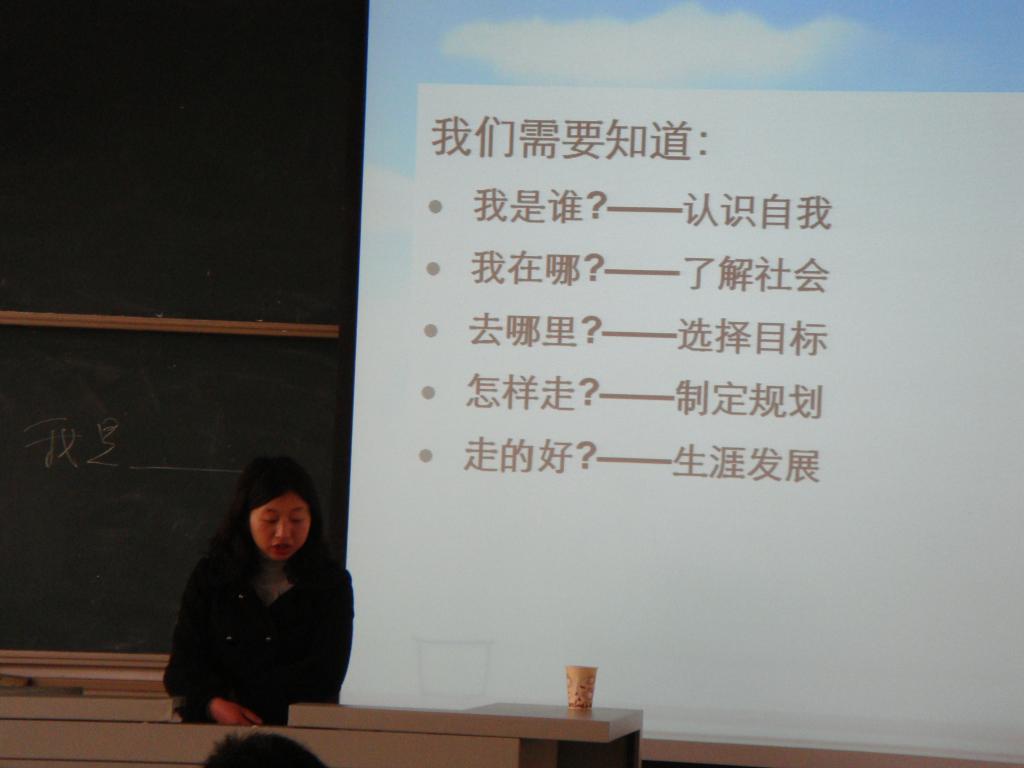 袁莉老师以一个问题:我上大学做什么?开篇,引起学生积极思考。袁老师把个人职业规划分为六个步骤:认识自我、了解社会、选择目标、制定规划、生涯发展,并且针对每一个环节运用心理学的观点加以剖析。袁老师指出职业生涯规划是双赢的,对个人对公司都有好处,个人要处理好兴趣与职业、价值观与职业、能力与职业、性格与职业的关系。最后还送给学生们两句富有丰富内涵的个人格言:“选我所爱,爱我所选”和“发现自我,定义自我,明确自我,成就自我”,激起学生一片片掌声。