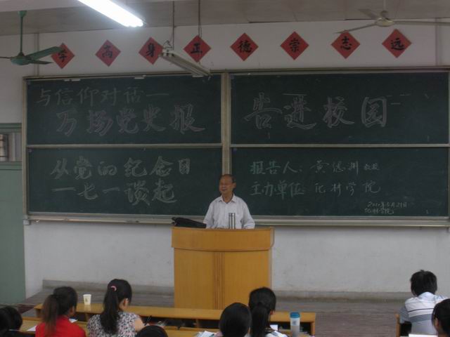 黄教授以“从党的纪念日——七一谈起”为主题,先给同学们介绍了一大的召开和七一党成立纪念日的由来,并着重介绍了党的九十年历程中三大历史阶段、四次重大挫折和五创辉煌,同时,黄教授还饱含深情地带领同学们回顾了祖国的昨天,向同学们介绍了祖国的今天,并对祖国的明天表达了美好憧憬。