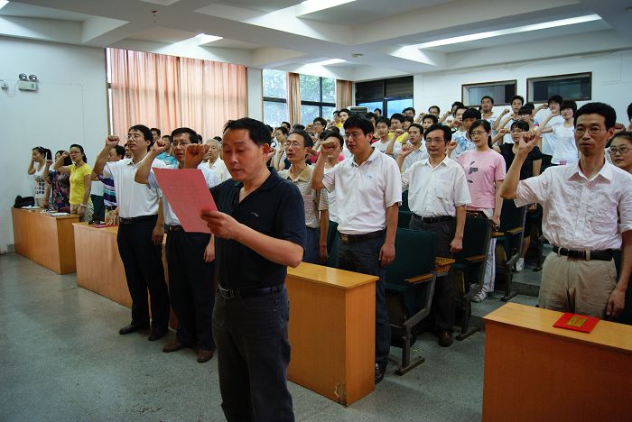 表彰大会之后,美高梅4858线路登录教工党员代表和全体学生党员开展了重温入党誓词活动。广大党员面对党旗高举右手,庄严宣誓,表达了共产党员的崇高信仰和坚定信念。大家纷纷表示一定会牢记誓词,永葆先进,以创先争优的实际行动向党的九十华诞献礼。
