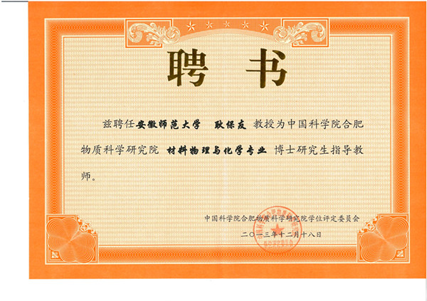 本网讯(美高梅4858线路登录 张园园)近日,美高梅4858线路登录合肥物质科学研究院学位评定委员会寄来聘书,聘请美高梅4858线路登录副院长、教授、博士生导师耿保友为中科院合肥物质科学研究院材料物理与化学专业博士研究生指导教师。