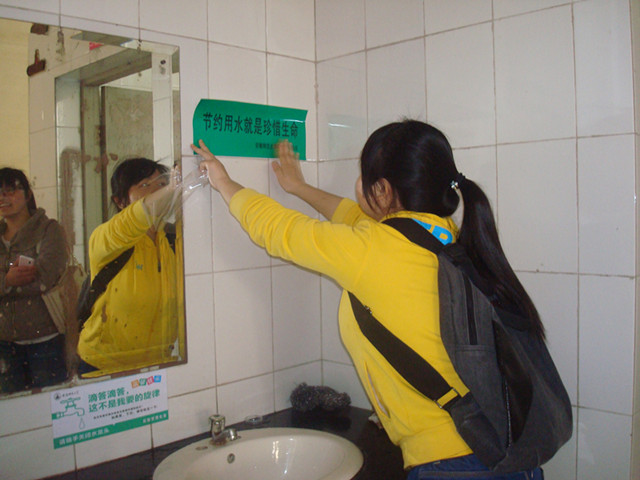 低碳生活,张贴节水标语。在同学们的热心支持和积极参与下,环境保护协会共征集到三百余条节水标语,志愿者从中挑选出优秀作品,并将这些优秀标语制作成“温馨小提示”张贴在花津校区和赭山校区的用水场所,藉以呼吁大家节约用水从身边做起、从点滴做起,不让地球上的最后一滴水成为人类的泪水。
