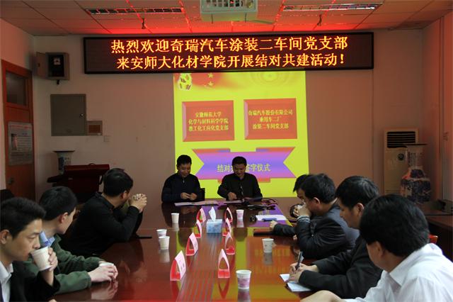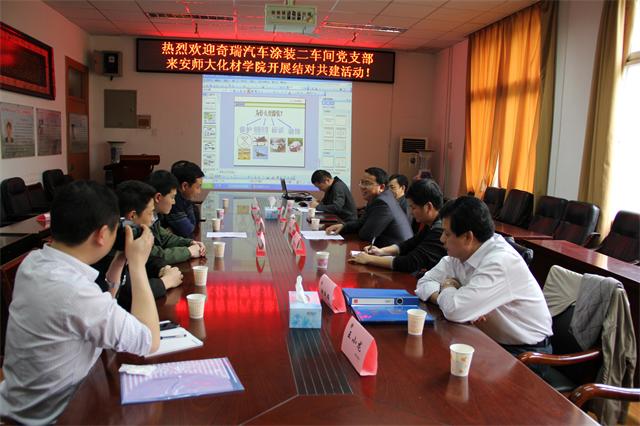本网讯(美高梅4858线路登录 罗时忠)为深入贯彻落实党的十八大和十八届三中全会精神,进一步推进美高梅4858线路登录党的群众路线教育实践活动,充分发挥高校和企业基层党组织的自身优势,根据省委教育实践活动领导小组《关于在全省第一批教育实践活动单位中开展“党员干部走基层行动”的实施意见》(皖群组发〔2013〕18号)和省委教育工委有关文件精神,按照《关于做好城乡基层党组织结对共建推进工作的通知》(校群组办发〔2013〕8号)的要求,美高梅4858线路登录教工化工应化党支部积极响应学院党委的号召,在3月29日下午,和奇瑞汽车股份有限公司乘用车二厂涂装二车间党支部开展结对共建活动。学院党委史铁杰书记和副院长耿保友教授应邀出席了本次会议。这是该支部积极践行群众路线和学习贯彻“两会”精神的系列活动之一,活动由支部书记罗时忠教授主持。
