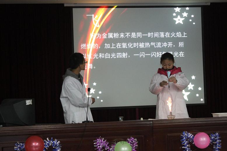 经初赛笔试、复赛技能比拼后,共有9组选手进入决赛。斑斓的色彩“魔壶实验”勾起了观众儿时的梦想;“星光飞舞”则带领观众走进烟火的世界,炫彩的火花更添了一丝梦幻;“魔棒点灯”以话剧的形式将西方女巫童话、三顾茅庐经典历史桥段与科普实验有机结合;而武俊、缪恒则用多种金属元素的焰色反应模拟了2008年北京奥运圣火点燃和传递的场景,橘黄、猩红、橙红以及黄绿色的火光更带给了观众视觉上的冲击和享受,引得观众争相上台,在《we will rock you》的歌声体验点燃“火炬”的快乐。“紫花变兰花”、“水火相容”的实验让生活中看似不可思议的事情变成了现实,把同学们和老师都惊得目瞪口呆,引起观众们雷鸣般的掌声。大赛期间还穿插了“化学知识竞答”互动环节,让同学们在轻松的氛围中提高化学知识,激发探索化学实验奥秘的兴趣。