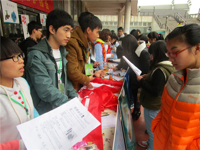 离足校园,宣传世界水日。3月20日,环保志愿者于赭山校区食堂门口摆好展架、搭好宣传台,科普世界水日相关常识,展现水资源对于人类生存的重要性,倡导大家节约用水、保护水环境。活动现场,同学们积极响应并热情参与,2014级材料化学专业曹泽平同学在看到展板上因严重缺水而干涸开裂的田地时说到,“正因为有了水,世界才会变得如此缤纷多彩,节约用水、保护水源关系到我们每个人切身的生活!”。此外, 环保志愿者还通过Myouth、微信公众号、QQ、微博等新媒体渠道发布“绿色使者”公开招募令,努力让更多的同学成为“绿色使者”,进入中小学环保宣教基地走上环保宣教课堂,宣传环保理念、传播环保知识,从而让环保变成一种行动,让环保变成一种传承。