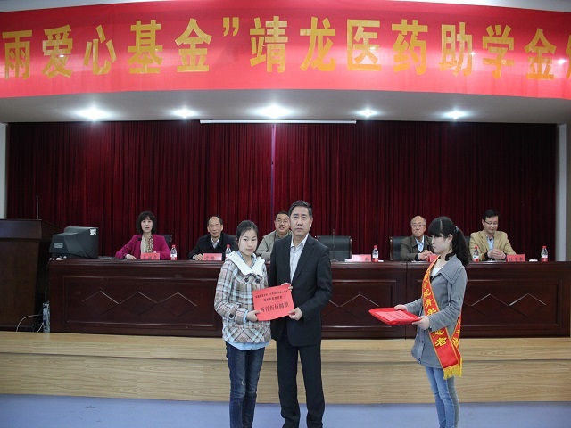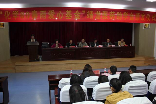 本次助学金颁发仪式在欢快的音乐声中拉开帷幕。首先,校学生工作处副处长张玉新宣读了首届靖龙医药助学金的颁发决定。随后,陈礼勤博士亲自为四十位受助学生依次颁发了助学金。每位受助学生满怀感激之情,纷纷与陈礼勤握手言谢,并合影留念。12化学专业的姚娟娟同学作为受助学生代表发言。她代表所有受助学子表示在受助之后会更加努力的学习,奋力拼搏,潜心钻研,不辜负捐资人和学校的殷切关怀,并以捐资人为榜样,用艰苦奋斗的精神和行动将爱心传递下去。