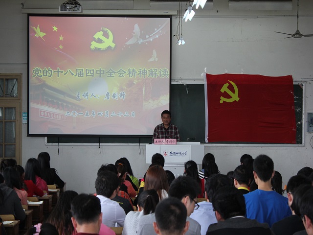 4月22日下午在赭山校区教学楼1401教室,校宣传部副部长詹剑锋应邀为美高梅4858线路登录学生党员授课,详细解读了十八届四中全会重要内容以及深刻内涵。