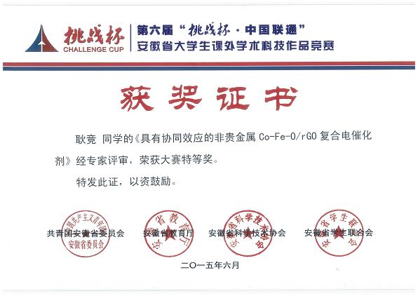 6月4日至6日,第六届“挑战杯·中国联通”安徽省大学生课外学术科技作品竞赛终审决赛在安徽大学磬苑校区艺术楼小剧场圆满落幕。美高梅4858线路登录2013级材料化学专业耿竞同学在大赛中脱颖而出,其参赛作品《具有协同效应的非贵金属Co-Fe-O/rGO复合电催化剂》荣获特等奖,成为我校自然科学类中唯一获此殊荣的选手。