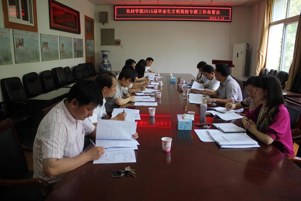 为确保美高梅4858线路登录2015届毕业生安全、文明、有序离校,6月19日上午,学院专题部署毕业生文明离校工作,院党委书记史铁杰、院长朱昌青、副院长高峰、副院长刘桂云、院党委副书记余妍霞,化学、应化、材化、化工四个系主任和全体专职辅导员老师参加会议。会议由史铁杰主持。