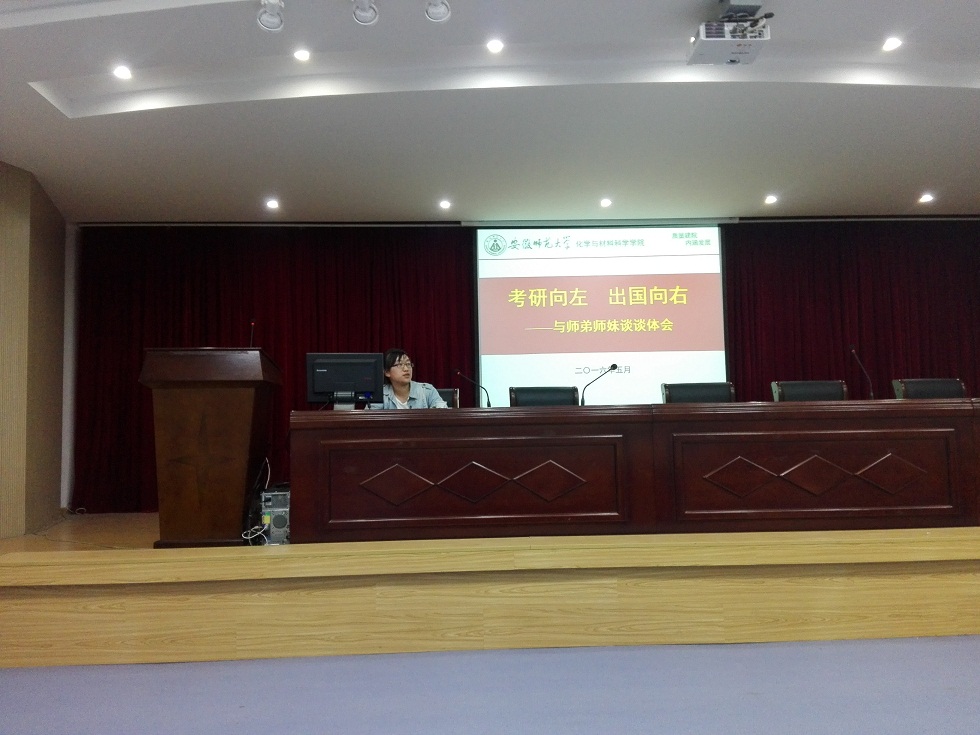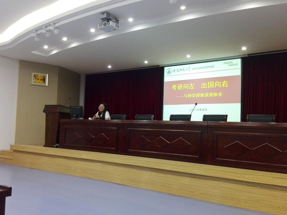 本网讯(2015级化学师范专业 王睿)2016年5月11日晚,美高梅4858线路登录在图书馆报告厅成功举办以“考研向左,出国向右”为主题的学习经验交流会。参加交流会的有2015级辅导员蒋建伟老师、魏杰顶老师以及受邀分享经验的获得美国、澳洲等多所名校录取通知书的徐惠学姐、考研至长春应化所的张曼丽同学和保研至复旦大学张海宁同学。同时参会人员还有美高梅4858线路登录2015级各专业的同学们。