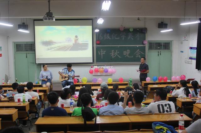晚会开始,同学们品尝着学院分发的月饼,观看班级精心选拔的节目。每个专业的安排都各具特色,各有千秋。在教学楼1109教室,张睿玉、张彤彤等同学带来了搞笑类编舞《咋了爸爸》, 5名女同学用心的编排、幽默的表演充分点燃了现场的气氛。而在生化楼2023,应化专业的118名同学则和在校的蔡教官共度了温馨的中秋之夜,萧汉同学精彩的双节棍表演更是让全体同学大饱眼福。生化楼2034,化学专业509寝室的众位 “女神”也反转形象,表演了舞台剧《葫芦娃传奇》,强烈的“反差萌”让同学们欢声笑语不断。高苗丽、董王天慧的健美啦啦操也让80名化学同学收获了一场视觉盛宴。在2044教室,材化专业的王瑞同学则是用他充满磁性的嗓音演唱了经典歌曲《水调歌头》,勾起了117名“小菜花”浓浓的思家情结。之后,穿插的游戏“谁是卧底”更是将晚会推向了高潮,拉近了同学们心的距离。值得一提的是2033的化学英才班,虽然只有40名同学,但周到的准备、精心的策划为全体同学献上了难忘的一晚。孙博文、江帆同学联袂表演的吉他伴唱《虫儿飞》深深地打动了在场的观众,王子宁同学精彩的古筝表演也令人耳目一新。辅导员王国良也献上了歌曲《蜗牛》,表达了对英才班诸位同学深切的期望和鼓励。最后,三位辅导员都向同学们献上了节日的祝福,并期望同学们能有一个圆满的大学生活。