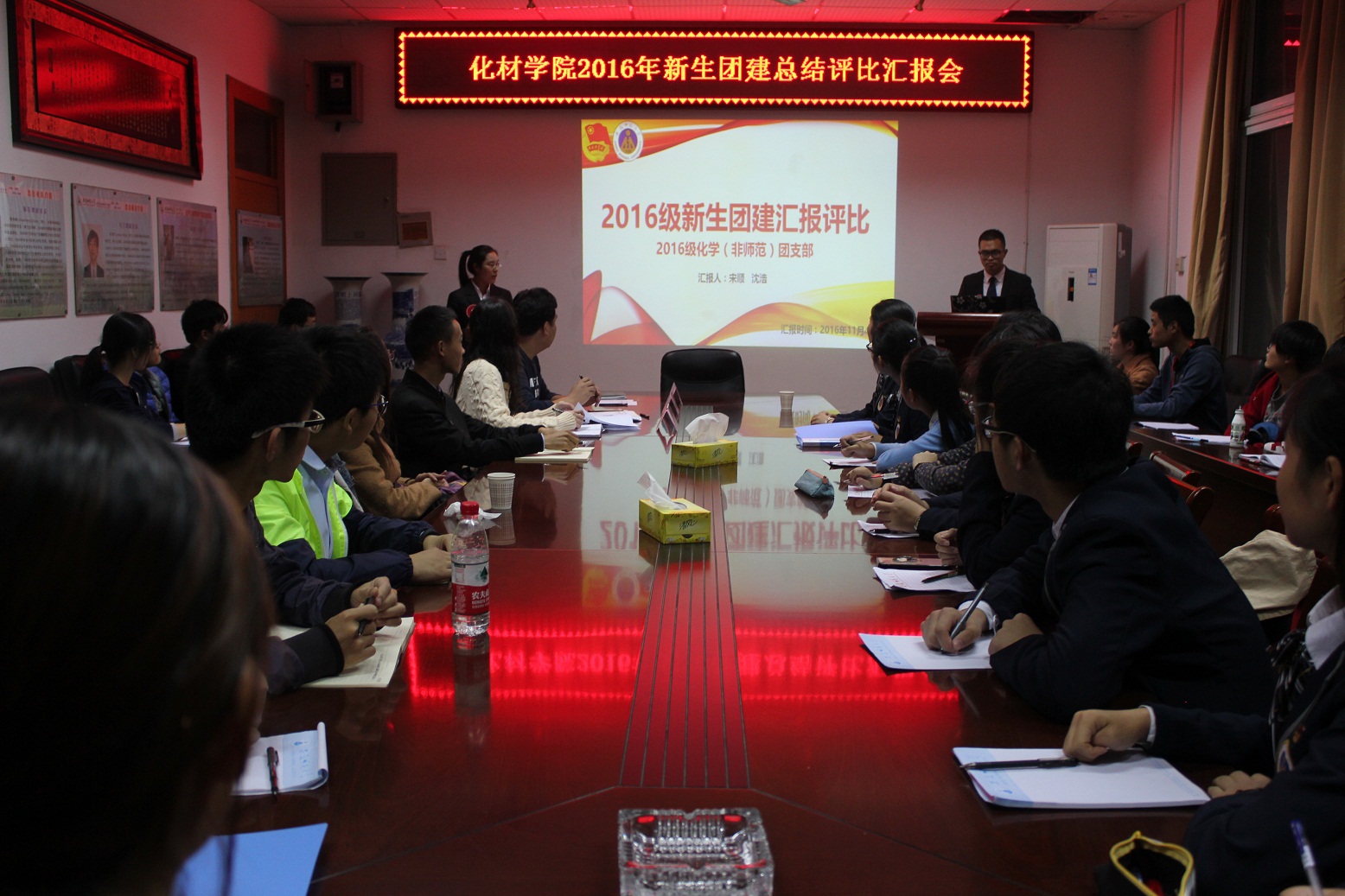 本网讯(美高梅4858线路登录 阮梦洁 余跃)11月4日晚七点,美高梅4858线路登录2016学年新生团建评选汇报会于生化楼大会议室隆重举行。学院团委蒋建伟老师及2016级辅导员王国良、朱珊老师受邀出席并担任评委,2016级各班级代表参加了此次汇报会。