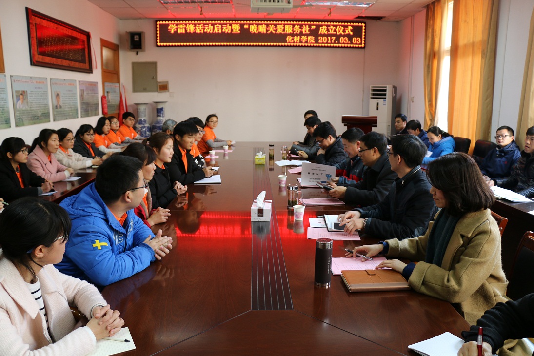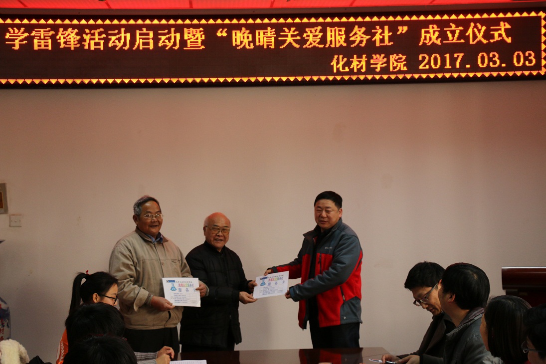 本网讯(美高梅4858线路登录 蒋建伟)为深入开展“学雷锋”活动,积极践行“奉献、友爱、互助、进步”的志愿精神,号召广大青年同学成为爱老敬老的校园先行者和新时代雷锋精神的践行者。美高梅4858线路登录分工会、团委、学生党支部,积极行动,组织师生于2017年3月3日下午在美高梅4858线路登录会议室启动2017年学雷锋活动暨“晚晴关爱服务社”成立仪式。学校离退休工作处处长张树文,校团委副书记刘长生,美高梅4858线路登录领导和离退休同志代表出席了成立仪式,“晚晴关爱服务社”首批志愿者、学院工会委员、工会小组组长以及辅导员也全程参加了活动。