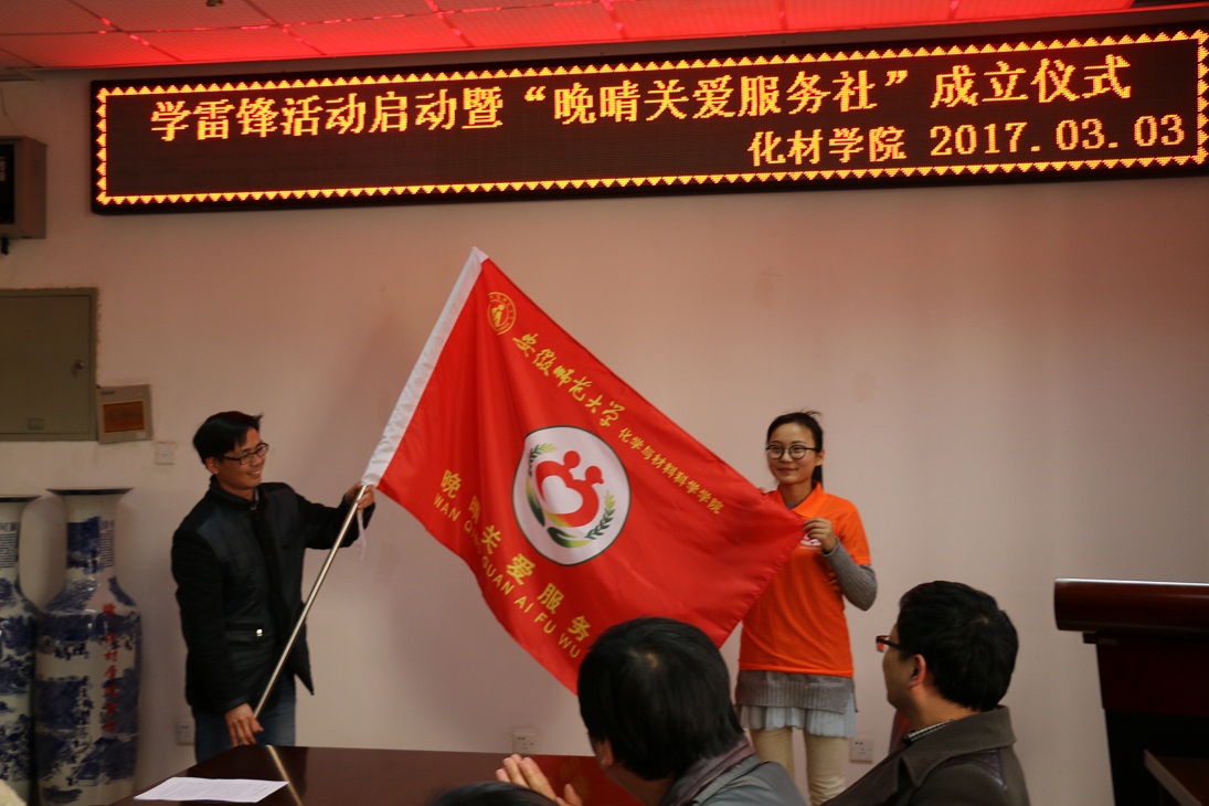 仪式上,学院副院长刘桂云向全体师生志愿者全面解读了“晚晴关爱服务社”的志愿服务结对帮扶工作机制,进一步明确了以“需帮扶的离退休同志、工会委员和学生志愿者”为主体的结对帮扶工作方案。离退休工作处张树文宣读了《美高梅4858线路登录关于成立晚晴关爱服务社的决定》。校团委副书记刘长生向志愿者队长授予队旗。2014级材料化学专业团支书作志愿者代表发言,表达了首批志愿者做好晚晴关爱服务结对帮扶离退休老同志工作的坚定决心。