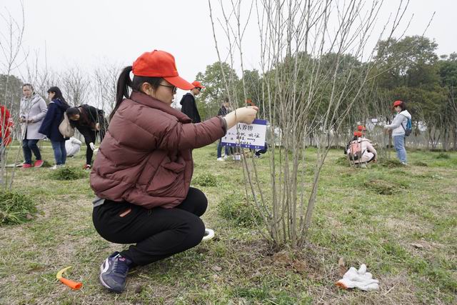 早上9时,护树活动正式开始。在后勤吕师傅的指导下,50名同学2、3人一组,使用工具进行除草、修枝等工作。在各自的划分区域中,同学们分工明确,默契配合,用辛勤的劳动让“化学林”焕然一新。之后,现场举行了简单的认领仪式。各位同学将写着真挚寄语的认领牌悬挂在木槿花树的主枝干上,既寄托了同学们成长成才的梦想,又表达了自己长久护树、致力环保的决心,同学们纷纷表示将来搬到花津校区后,一定会与认领的树木共同成长,相伴四年。最后,指导教师王国良同各位志愿者将杂草、垃圾等收拢在一起,交由校工处理,此次活动也宣告结束。