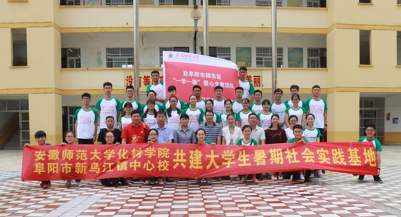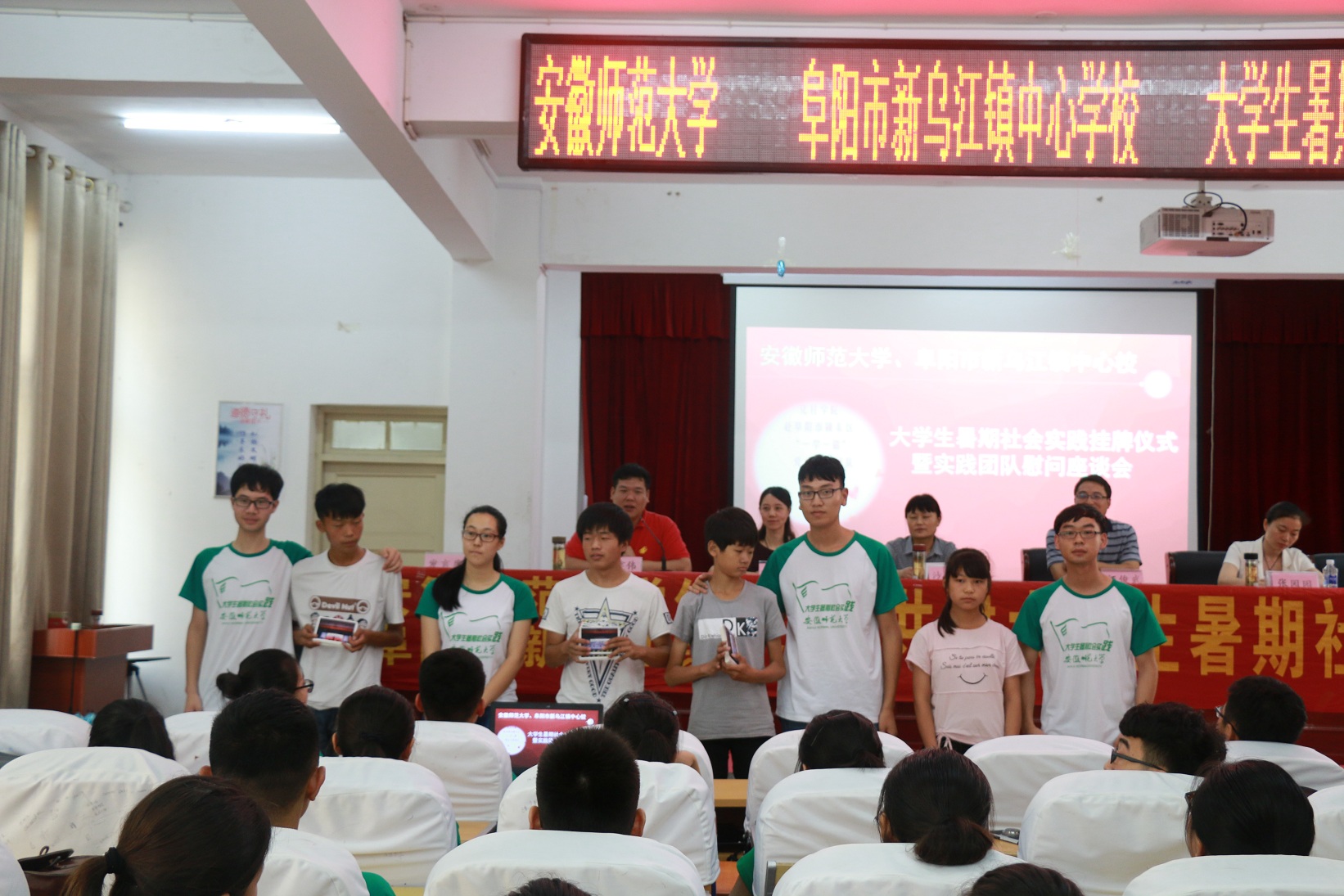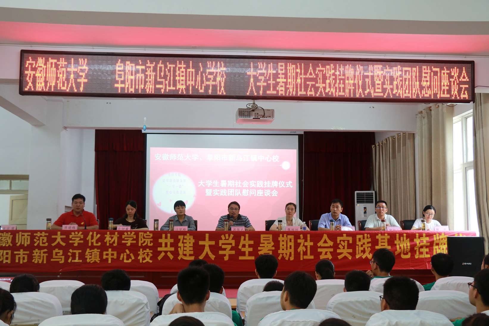 本网讯(文/图 学生会宣传部 彭青)一学一做先锋行,实践躬行见真知。7月7日,安徽师范大学美高梅4858线路登录与阜阳市颖东区新乌江镇中心校合作共建大学生社会实践基地揭牌仪式在新乌江镇中心校举行。阜阳市颖东区副区长沙学珍、新乌江镇人大主席牛任飞、新乌江镇中心校总校长宫鹏飞,安徽师范大学校团委副书记张园园、美高梅4858线路登录党委书记汪俊武、副书记余妍霞等应邀出席,32名社会实践志愿者和新乌江镇中心校九年级学生参加仪式。活动由学院团委副书记蒋建伟主持。