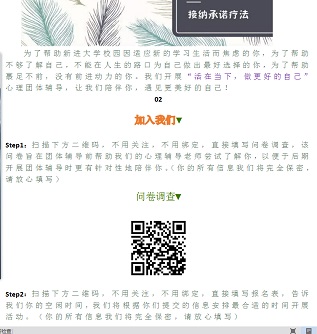 为积极响应“1025邀你爱我”心理健康日,美高梅4858线路登录大学生发展辅导站特推出“ACT”团体辅导活动,以问卷调查结合线上报名的方式在全院同学内招募活动对象,成长途中,同学们不免有失意、无助、彷徨之时,也总有着那么一件自豪、开心或是伤心、遗憾之事,在这里,我们听你所诉,同你之乐、解你之忧,做好美高梅4858线路登录同学的好“树洞”。