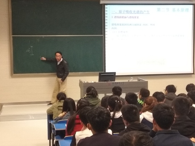 本次课堂教学内容是原子吸收光谱法的基本原理。朱老师从对原子发射光谱法的回顾引入,采用仪器部件展示的方式,引导同学们从方法原理、特色优势、历史沿革三个方面,比较原子发射、原子吸收和原子荧光三种光谱法的异同点,为同学们构建了层次分明、结构立体的知识框架。朱老师重点讲解了原子吸收光谱法瓶颈问题的解决,通过对科学家Walsh在原子吸收光谱测量方面重大贡献的介绍,结合“小蚂蚁吃大饼”的生动比喻,让同学们能快速搞清楚问题所在、找到解决办法、掌握测量原理。